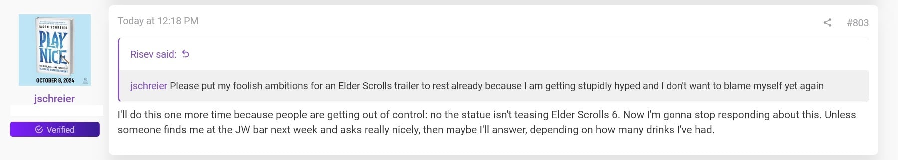 Schreier 可能很清楚雕像的用途,他认为有必要澄清事实。在ResetEra 论坛上他说:"我再说一次,因为人们已经失控了:雕像不是在预告《上古卷轴 6》。现在我不会再回应此事了。"