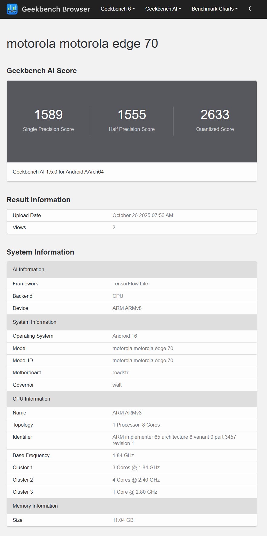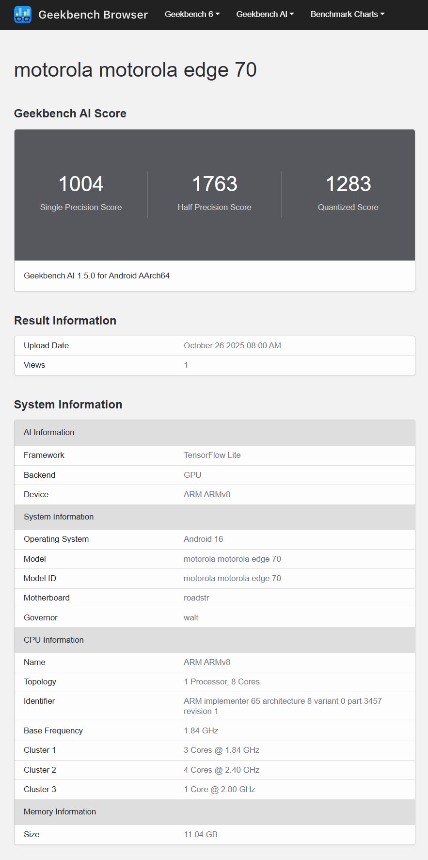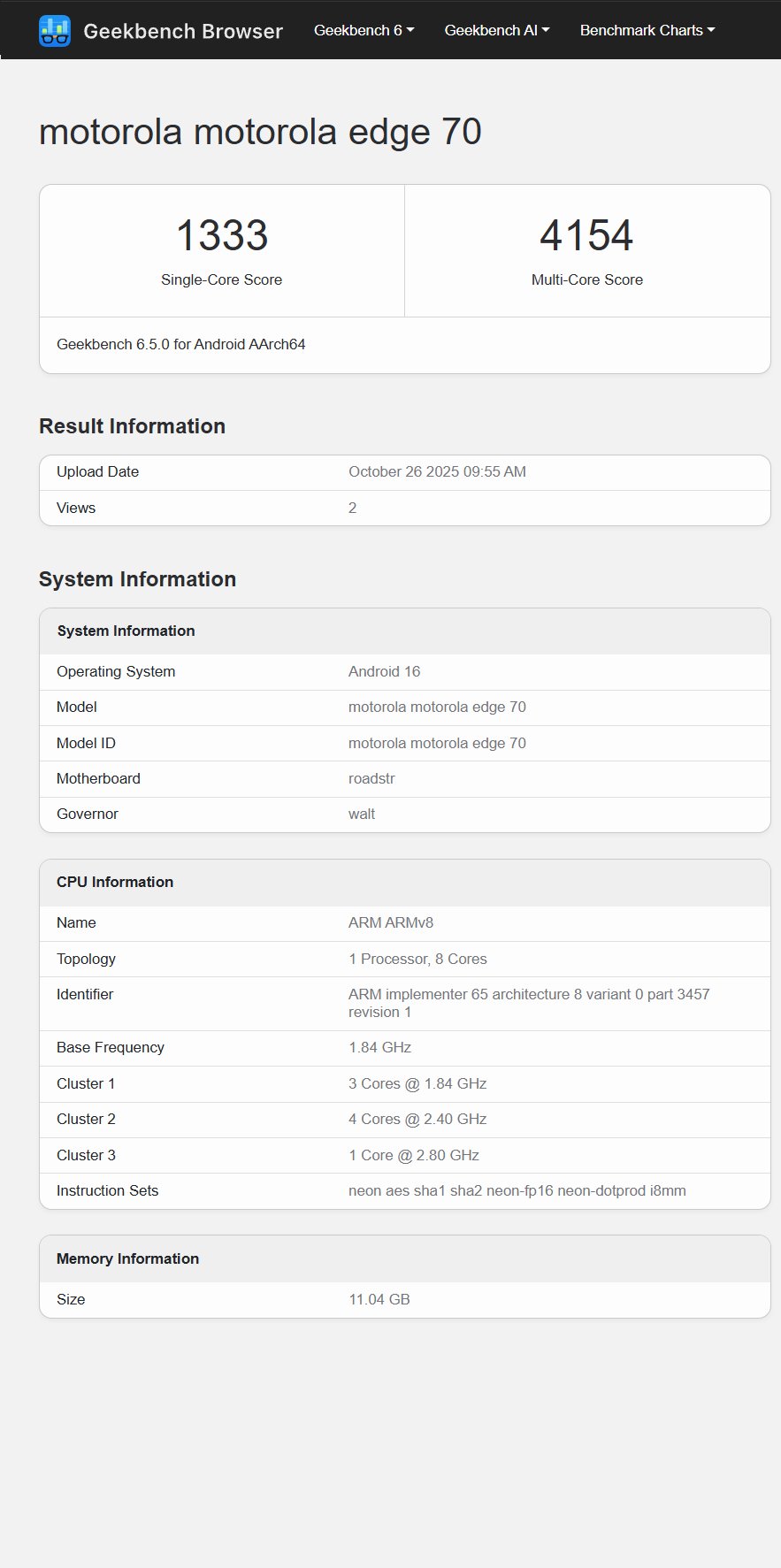 如下图所示,摩托罗拉为该芯片组配备了 12 GB 内存和 512 GB 存储空间。根据 Geekbench 的早期结果,骁龙 7 代 4 和 12GB 内存的组合使 Edge 70 的 CPU 性能与 联发科 Dimensity 8350-搭载 Edge 60 Pro的 CPU 性能。