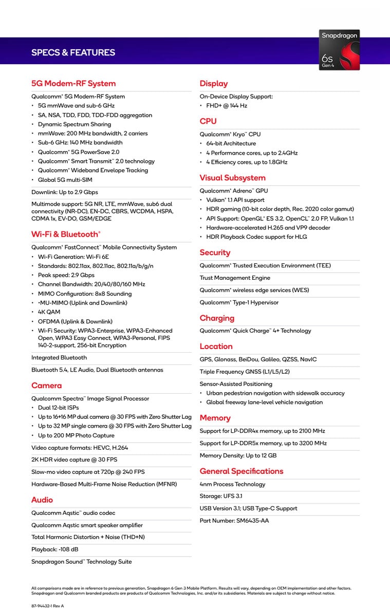 事实上,骁龙 6s Gen 4 的 CPU 布局和时钟速度与 骁龙 6 代 3.尽管如此,前者的频率跃升至 144 Hz,并支持 1080p 显示屏,还提供蓝牙 5.4 连接。更多详情,请参阅下面的高通公司产品简介。