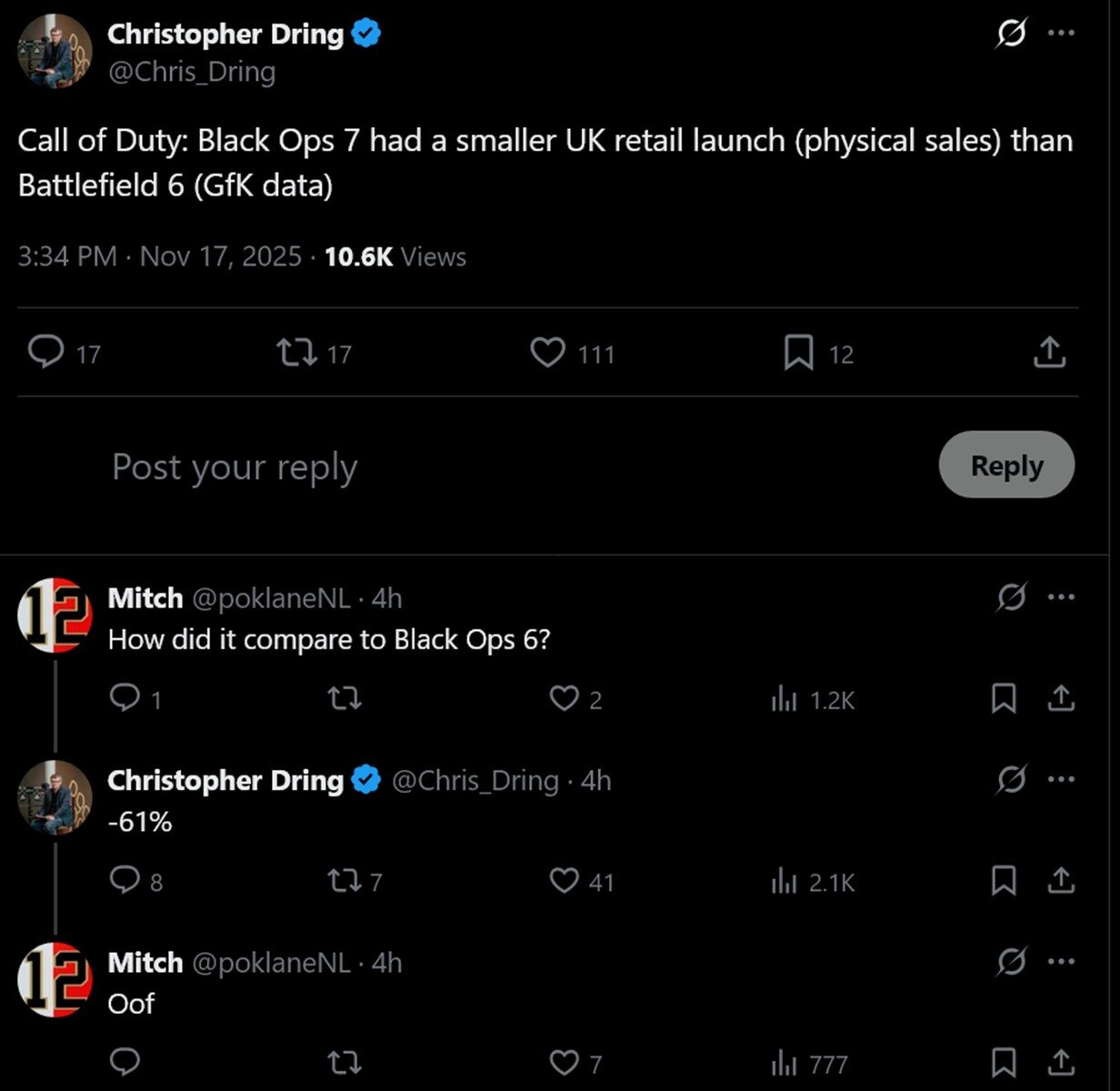 业界首次看到了《使命召唤:黑色行动 7》的零售业绩。 使命召唤:黑色行动 7.在英国,Gfk 的市场数据显示这款射击游戏落后于 战地 6.首周实体销量也比《黑色行动 6》骤降 61%。虽然这些数字不包括数字购买、 乏善可陈的 Steam 玩家数量表明该游戏的发售令人失望。
