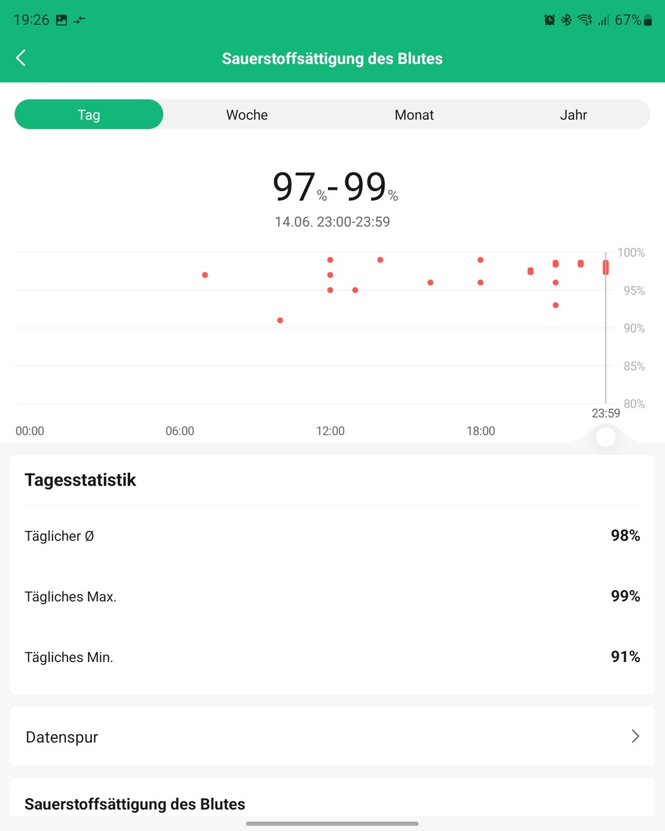 对于前辈的测试,我们在每种情况下都用经过医学认证的脉搏血氧仪在同一时间比较了饱和度。在当时的一系列测量中,该 智能手环6一直估计饱和度太高,最低为97%。目前的小米手环现在显示的波动范围最高为91%。