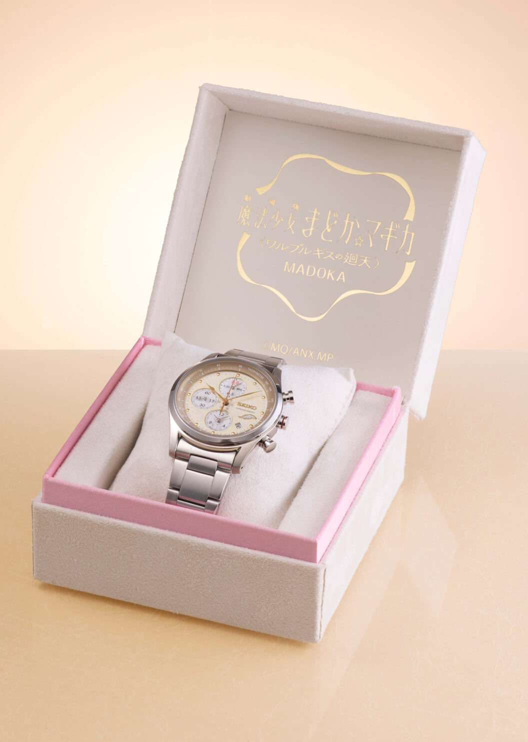 此次合作包括两款不同的腕表。.Madoka 表款(NEODAI-286770)采用淡香槟金色表盘,搭配拉丝不锈钢表壳。表盘上点缀着精致的粉色亮点和小表盘图案,这些图案从角色的变身丝带中汲取了大量灵感。Homura表款(MD25-1132002)则采用黑色离子镀表壳和深色表盘,更具侵略性。位于六点钟位置的小表盘展示了近期剧场版预告片中的 "奔跑的蜥蜴 "和 "跪着的 Homura "图标。