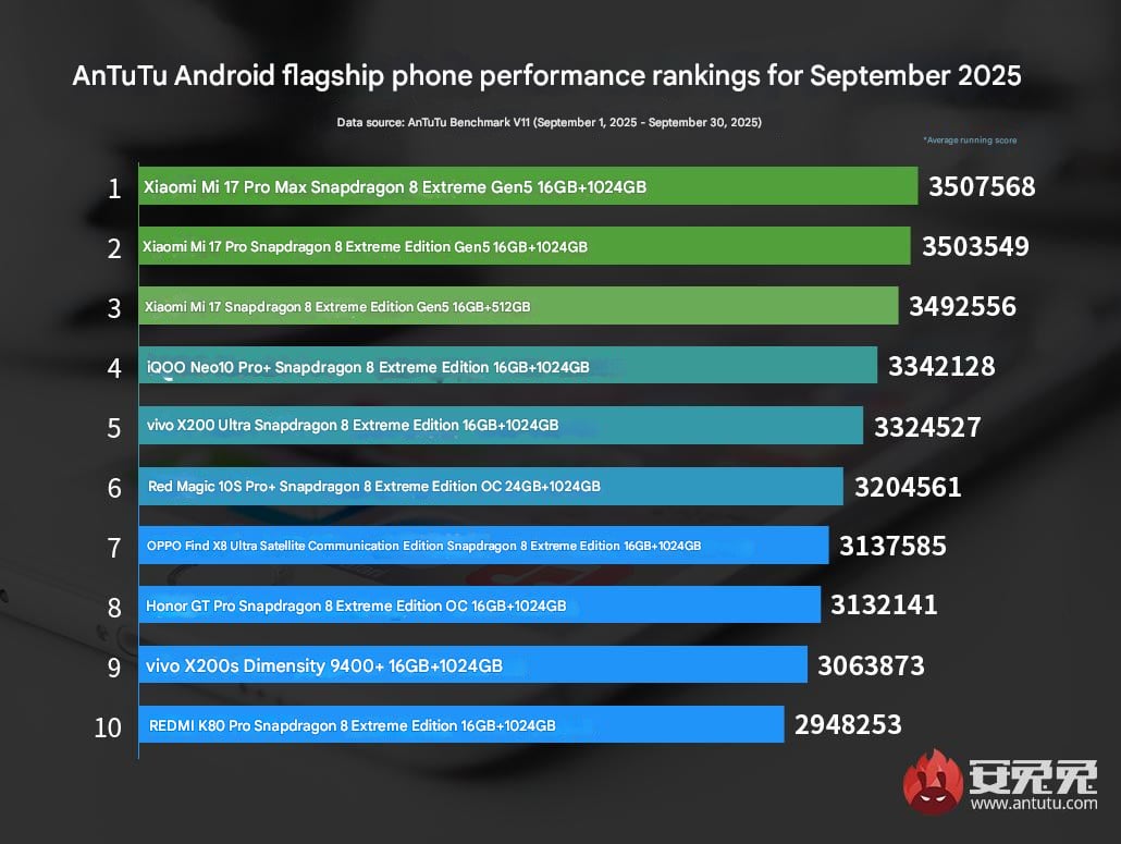 2025 年 9 月 25 日,小米在中国发布了首款骁龙 8 精英 5 代手机。鉴于竞争对手尚未正式推出旗舰手机,小米 17 系列暂时仍有些无人问津,这也最终使得该公司的新手机攀升至最新安兔兔性能排行榜的榜首。