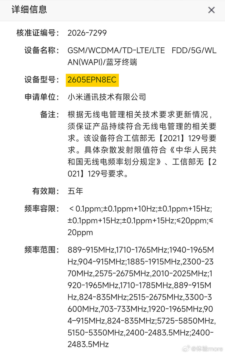 具体地说,多个消息来源称,中国国家无线电管理委员会认证了神秘的 "2605EPN8EC "在中国销售。仅从其型号来看,我们就可以推断出小米打算在 2026 年 5 月在其国内市场发售该设备。至于能否成真,目前还有待观察。