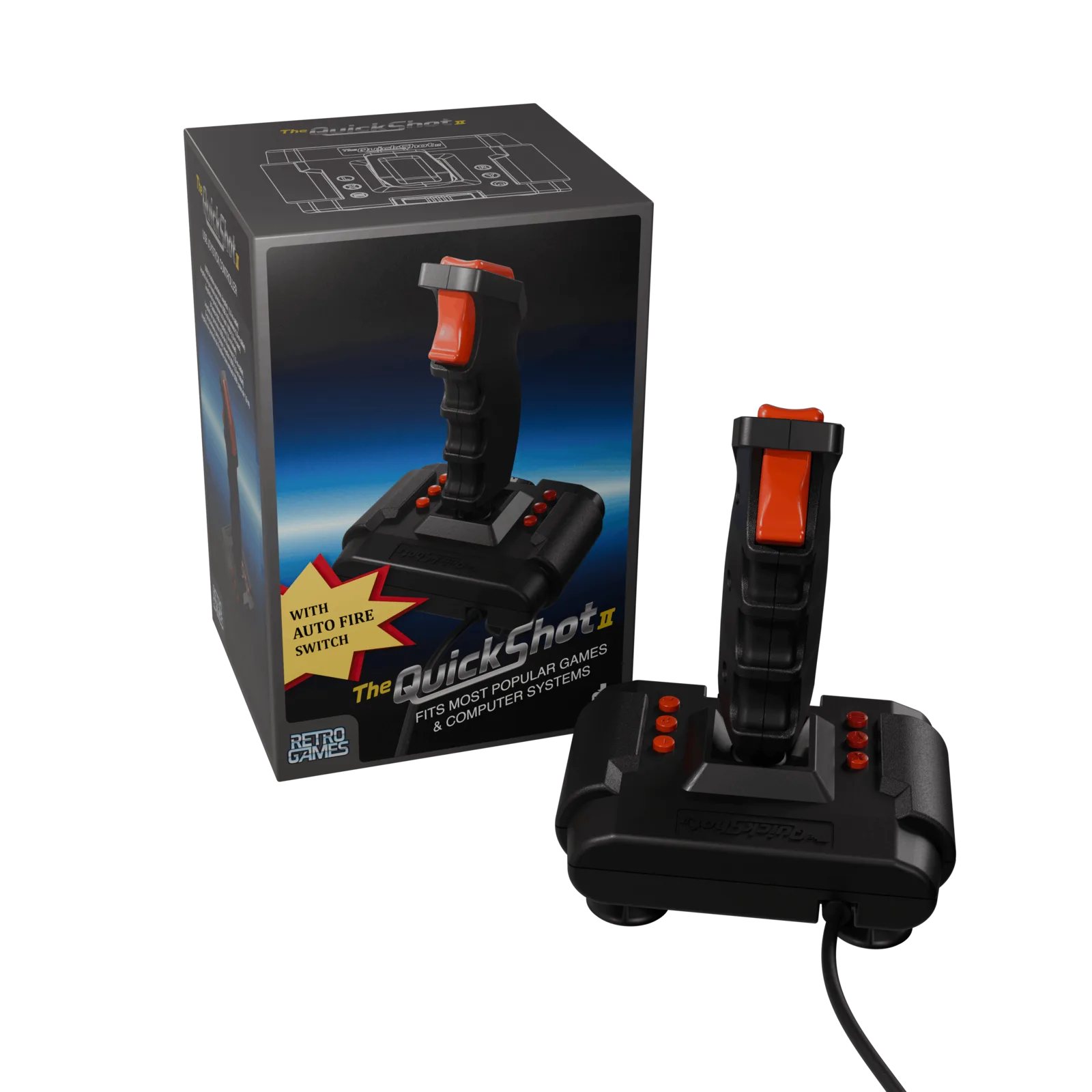 为了跟上现代控制器的步伐,Quickshot II 在升级后支持 USB 接口,并配备了一条 180 厘米长的 USB 电缆。除了个人电脑和各种复古设备外,该控制器还能与以下由 Retro Games 生产的家用电脑复制品配合使用:TheC64、The Spectrum、TheA500 和即将推出的 TheA1200。不过,它不能通过 9 针接口连接原始 C64 和 Commodore Amiga,也不提供无线连接。其他显著特点包括精确的微动开关、球形关节、两个动作按钮、六个可编程发射按钮、一个自动发射按钮和吸盘。