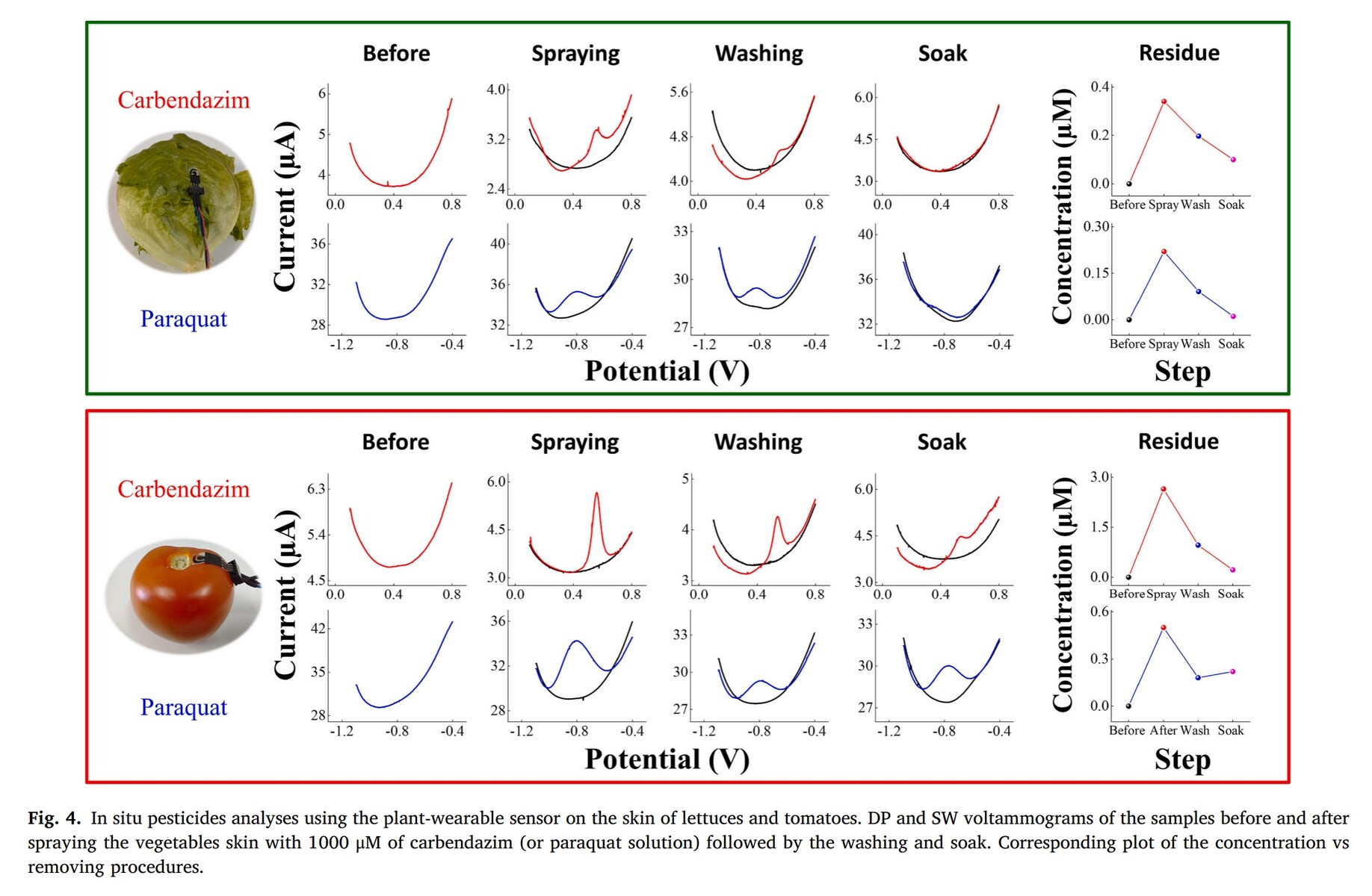 对传感器进行了测试,农药浓度为 0.1 至 1.0 μM(或 0.1 至 1 ppm),处于美国食品及药物管理局对粮食作物可接受浓度的下限。在莴苣和西红柿上喷洒农药后,即使经过数百次弯曲,传感器仍能保持较高的检测性能。在农产品受到农药污染以及通过水洗和浸泡去除污染的过程中,都能可靠地检测到农产品上的农药含量。在消费者传感器面世之前,不妨用顶级蔬果清洗剂(如亚马逊上的这款)清洗蔬果,以防止杀虫剂进入体内。