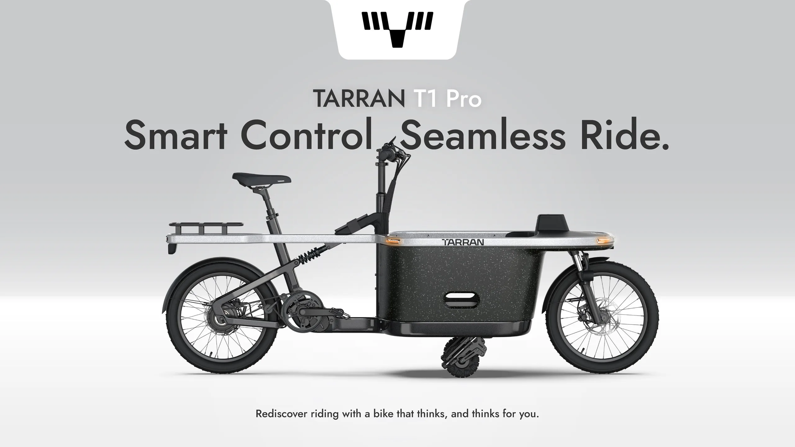 这是一款货运电动自行车,带有 前置式设计,而不是 长尾尽管它采用了"智能间距"技术,将长度缩短至 2.26 米(或约 7.41 英尺)。不过,TARRAN 声称,可以将两个身高在 1.26 米(约 4.13 英尺)或以下的儿童并排放进它的 箱而不用担心翻倒。