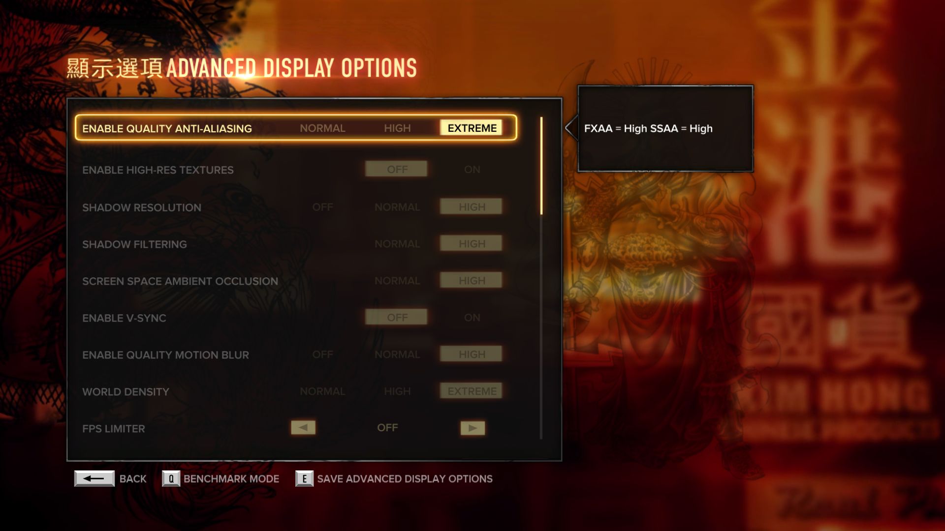 对于一个多平台的标题,睡觉的狗提供了一个高得惊人的数字设置。我们跑了的4个预置位;低,中,高和极端,这是坐落在主菜单中,我们的基准下的显示选项。除了亮度,也可以调节的接口的大小和分辨率。全萤幕模式和3D模式下也可以的(de)激活。