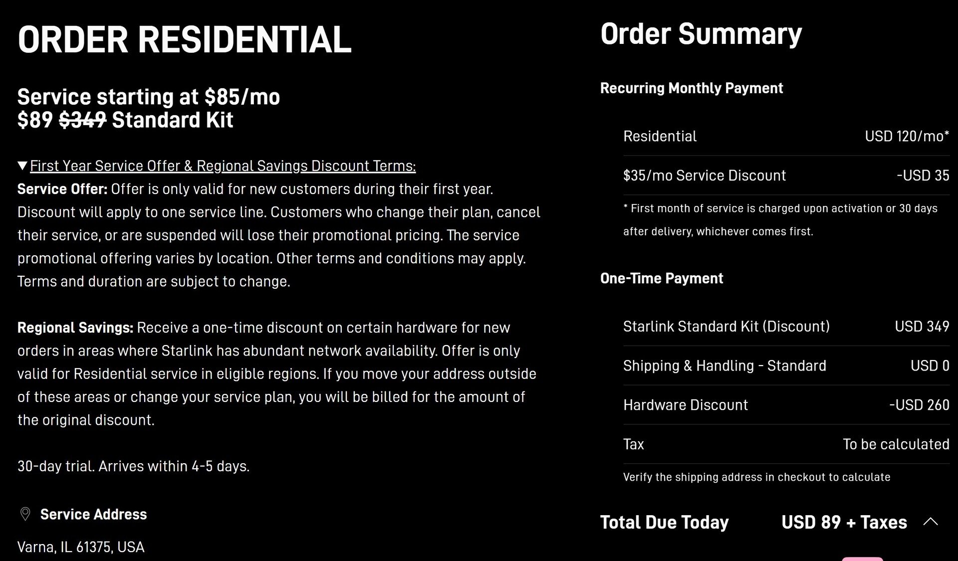 使用推荐链接注册后,推荐的星联客户将收到一封电子邮件确认函,并在新账户激活后 30 天内获得免费服务积分,在下一个账单期有效。在美国某些服务不足的地区,Starlink 正在 开展卫星天线和服务折扣促销活动,现在只需支付 89 美元的初始费用就可以开始使用其卫星互联网服务,如下图所示。