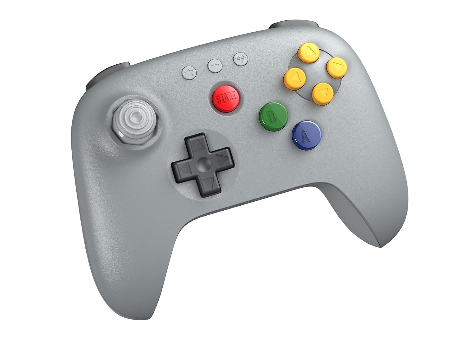 灰色 8BitDo 64 蓝牙控制器的设计与原始任天堂 64 控制器的颜色一致,灰色外壳、黄色 C 键、蓝色 A 键、绿色 B 键和红色开始键。D-pad 以及肩部按钮和触发器为深灰色。