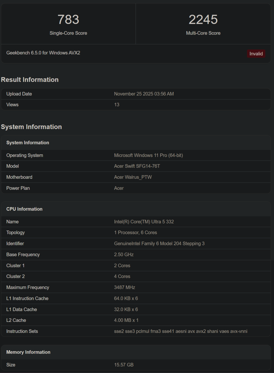 在入门级酷睿至尊 5 332 上,其Geekbench 分数被标记为无效。被标记为无效。但该列表确实显示了其规格,即 2 个 P-cores、2 个 E-cores 和 2 个 LPE-cores。这款笔记本电脑属于宏碁 Swift 系列,配备 16 GB 内存、RTX 5060 GPU 和未指定的英特尔图形适配器。
