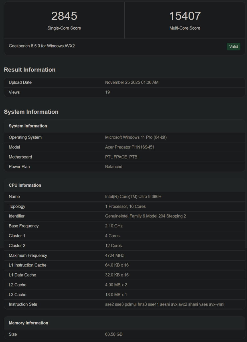 P 核心的主频高达 4.7GHz,比传闻中的 时钟频率略低于传闻中的 4.9 GHz。在图形处理器方面,它使用了一个未指定的英特尔显卡 SKU(而不是 Arc B390),结合一个 GeForce RTX 5060结合使用。最后,这款笔记本电脑拥有 64 GB 内存,似乎是即将推出的宏碁掠夺者变体。