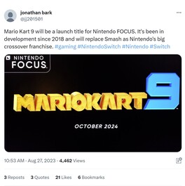 对于OP 来说,这实际上是一个相当勇敢的推测。因为在任天堂粉丝论坛上,关于下一款《马里奥卡丁车 》游戏名称的讨论相当激烈。有些人干脆从《马里奥卡丁车 8》跳到了《马里奥卡丁车9》,有些人坚持认为应该是《马里奥卡丁车10》或《马里奥卡丁车X》,因为《马里奥卡丁车巡回赛》被归类为该系列的主打游戏,甚至还有人认为《马里奥卡丁车11》才是正确的,因为你应该把《马里奥卡丁车8 豪华版》也算进去。无论如何,《任天堂 Focus/Switch 2》显然将与《任天堂世界》、《Relno Ramen Warrior》、《Arms 2》和《 F-Zero Titans》一起成为《马里奥卡丁车》的后继者。