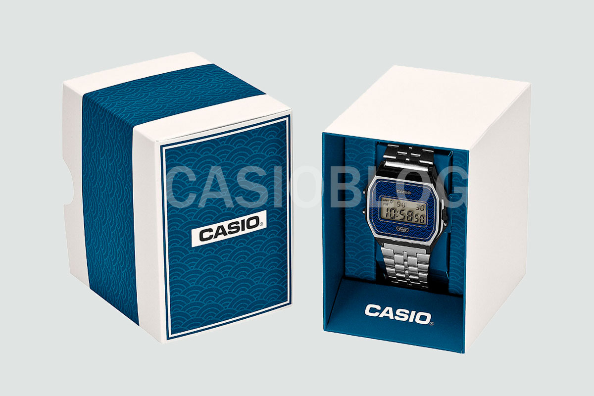 一个特别的小细节是表背的雕刻,据说是片假名 "Casio",与表盘的文化主题相呼应。包装也似乎是定制的,蓝色波浪图案延续到包装盒设计中。