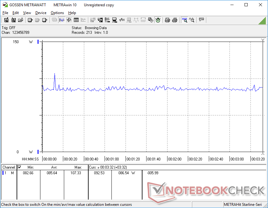 当CPU和GPU都处于100%的利用率时,我们能够从中小型(约13.8 x 6.8 x 2.4厘米)的150瓦交流适配器中记录到155瓦的最大消耗。在运行如此苛刻的负载时,电池的充电速度会变慢。