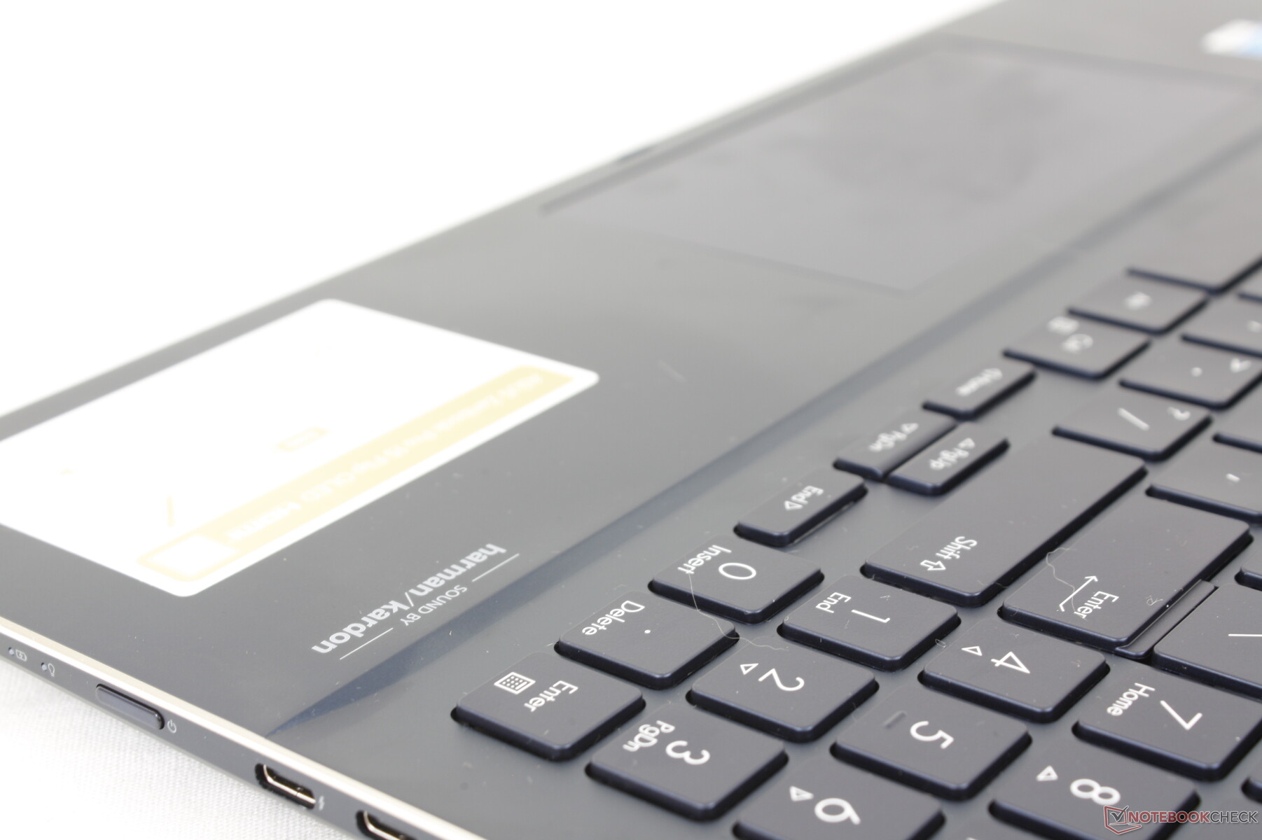 与老款ZenBook Flip 15 UX563FD相比,端口选项发生了很大变化。尤其是集成的HDMI端口和双Thunderbolt 4端口,对于连接大量的配件和外部显示器来说是非常好的。然而,端口的定位是有问题的,因为两个Thunderbolt端口和3.5音频插孔都非常紧密地挤在一起,沿着外部鼠标通常会在的右边缘。电源按钮也在附近,所以很容易不小心让笔记本进入睡眠状态。