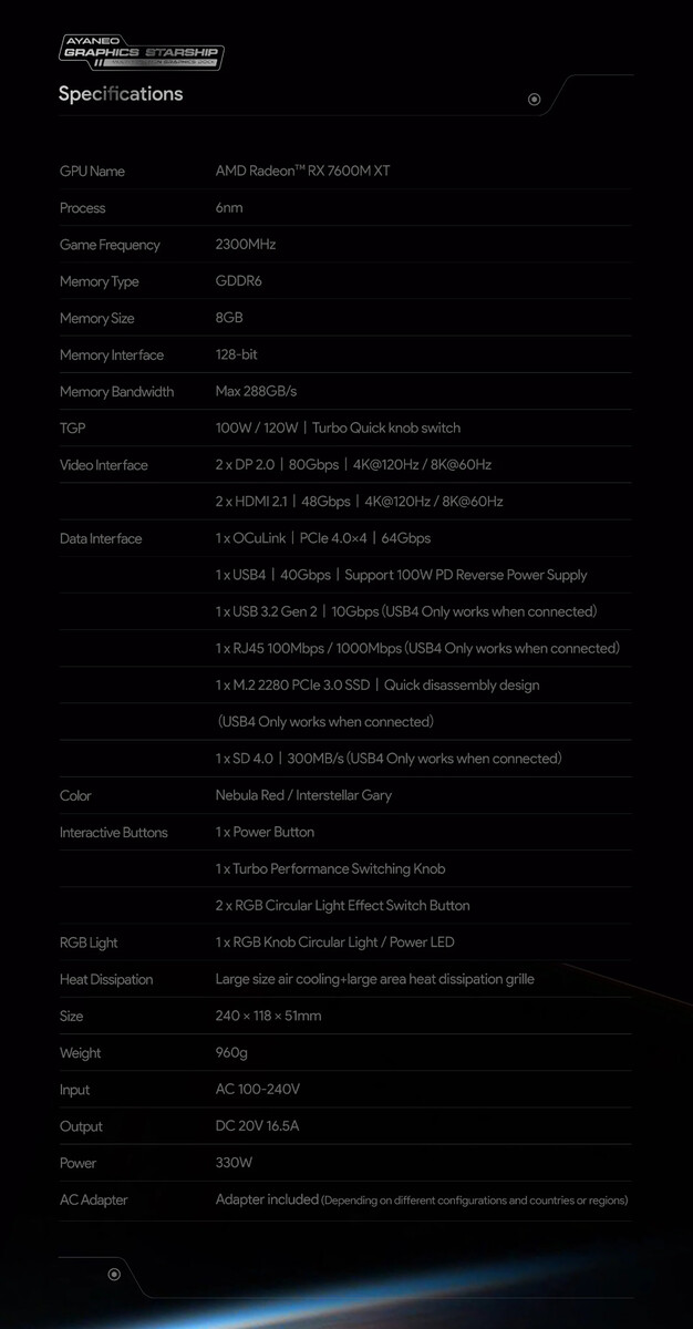 换句话说,AG01 的性能不如 OneXGPU 2的功能,后者采用了较新的 Radeon RX 7800M.正如下面的规格表所示,AG01 包含 DisplayPort 2.0、HDMI 2.1、USB4 和 OCuLink 等现代端口。此外,该 eGPU 还有一个 M.2 2280 插槽,支持 PCIe 3.0 传输速度和千兆以太网连接。