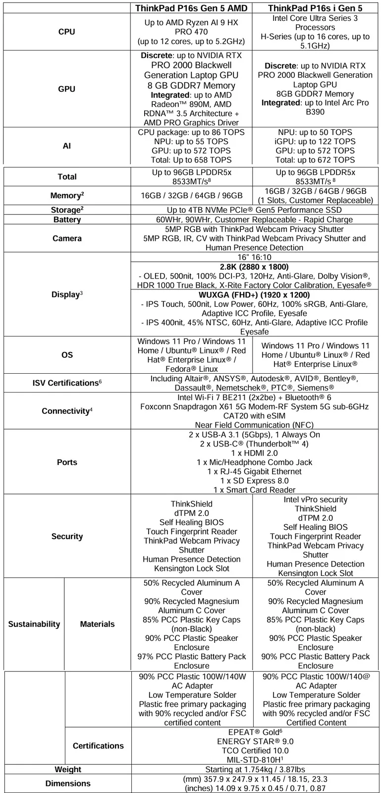 而 P16s Gen 4(亚马逊有售)也提供 AMD CPU,但联想为英特尔和 AMD 型号采用了不同的机箱设计。在 P16s 5 代中,两者采用了相同的机械设计,这也带来了 AMD 机型现在可以选择专用 GPU 的优势--联想最高将提供配备 8 GB VRAM 的 Nvidia RTX Pro 2000 Blackwell。新设计还包括 LPCAMM2 内存,内存容量高达 96 GB。这标志着 LPCAMM2 格式首次用于配备 AMD CPU 的笔记本电脑。