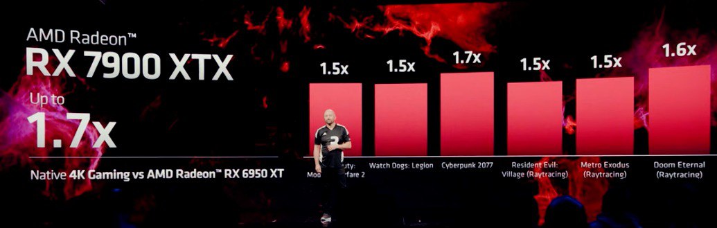 AMD声称,与RDNA 2相比,Radeon RX 7900 XTX提供了超过54%的性能/瓦。 在选定的游戏中,它比Radeon RX 6950 XT的4K速度快1.7倍。光线追踪性能并不那么令人印象深刻,但该显卡在诸如《赛博朋克2077》等游戏中能够超过60 FPS。 赛博朋克2077和《毁灭之光2》,至少在启用FSR的情况下。AV1编码/解码功能也是可用的。