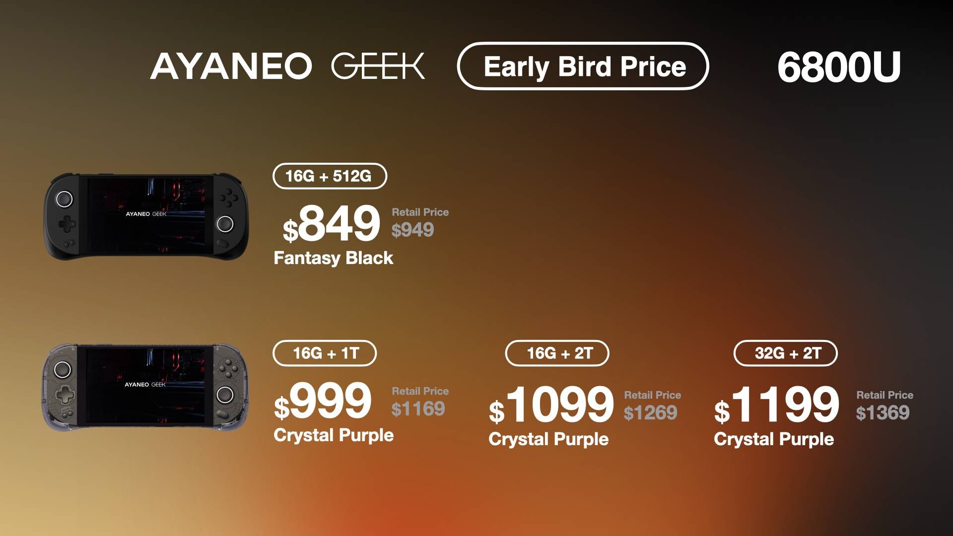 可供选择的硬件配置清单从16/512GB内存/存储开始,一直到32GB/2TB,只有AYANEO 2才有。 不过,这种硬件设置是通过两种颜色选择提供的,每一种都有不同的价格。天空白的价格为1,499美元,复古力量的设计为1,599美元。值得庆幸的是,超级早鸟价交易将上述价格降低了300美元。另一方面,最便宜的配置只得到150美元的折扣(16/512GB的AYANEO GEEK从949美元降至799美元,16/512GB的AYANEO 2从1099美元降至949美元)。