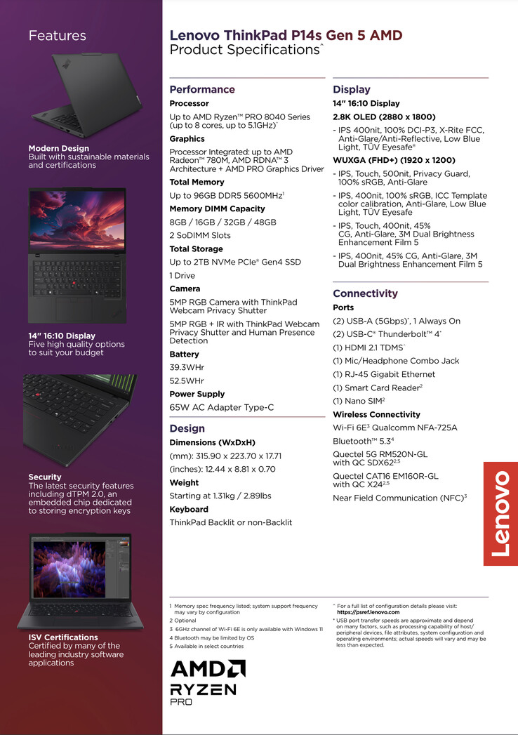 一方面,ThinkPad P14s Gen 5 缺乏像 ThinkPad P14s i Gen 5 中英伟达 RTX 500 Ada 代那样的独立 GPU 解决方案。因此,ThinkPad P14s i Gen 5 可能是某些专业 GPU 重型工作负载的更好选择。由于某些原因,ThinkPad P14s Gen 5 可配置 39.3 Wh 或 52.5 Wh 电池,而不是 ThinkPad P14s i Gen 5 内的 75 Wh 电池。