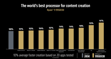 在性能方面,AMD 声称 Ryzen 9 9950X3D 的游戏性能比 Ryzen 9 7950X3D 平均提升了 8%,在内容创建方面提升了 13%。不出所料,它超越了英特尔基于箭湖系统的 酷睿至尊 9 285K在游戏和内容创建方面分别领先 20% 和 10%。