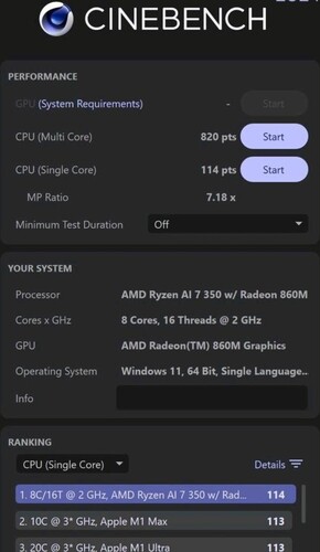 接下来,在 Cinebench 2024 中,Ryzen AI 7 350 Ryzen AI 7 350在相同的测试中分别获得了 114 分和 820 分。在这里,Krackan Point CPU 的表现再次与 Ryzen AI 7 Pro 360(108/708)不相上下。但 Ryzen 7 8845HS在多核性能(896)方面占据优势,但在单核性能(104)方面却落后于 Ryzen 7 8845HS。这可能是鹰点 APU 上八个全脂 Zen 4 内核的结果。