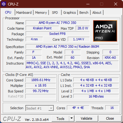 产品 AMD Ryzen AI 7 Pro 350是一款面向企业笔记本电脑的 AMD 处理器,拥有八个内核。这款 "Krackan Point "CPU 有四个 Zen5(最高 5 GHz)和四个 Zen5c(最高 3.5 GHz)内核,AMD 将其 TDP 额定为 28 W。 CPU 基准列表.