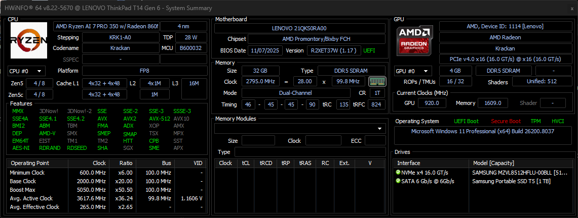 | Lenovo ThinkPad T14 Gen 6 AMD AMD Ryzen AI 7 PRO 350 ⎘ AMD Radeon 860M ⎘ 32 GB Memory, 512 GB SSD | List Price: 1800 Euro | 1.4 kg | 22.1 mm | 14.00" 1920x1200 162 PPI | |