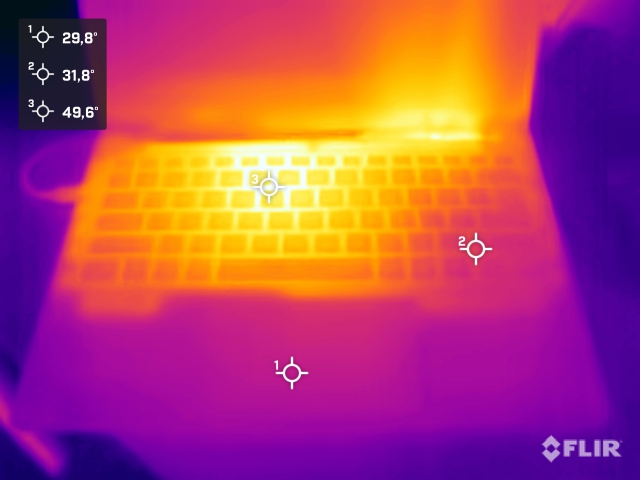 (+) The palmrests and touchpad are cooler than skin temperature with a maximum of 28.8 °C / 83.8 F and are therefore cool to the touch.