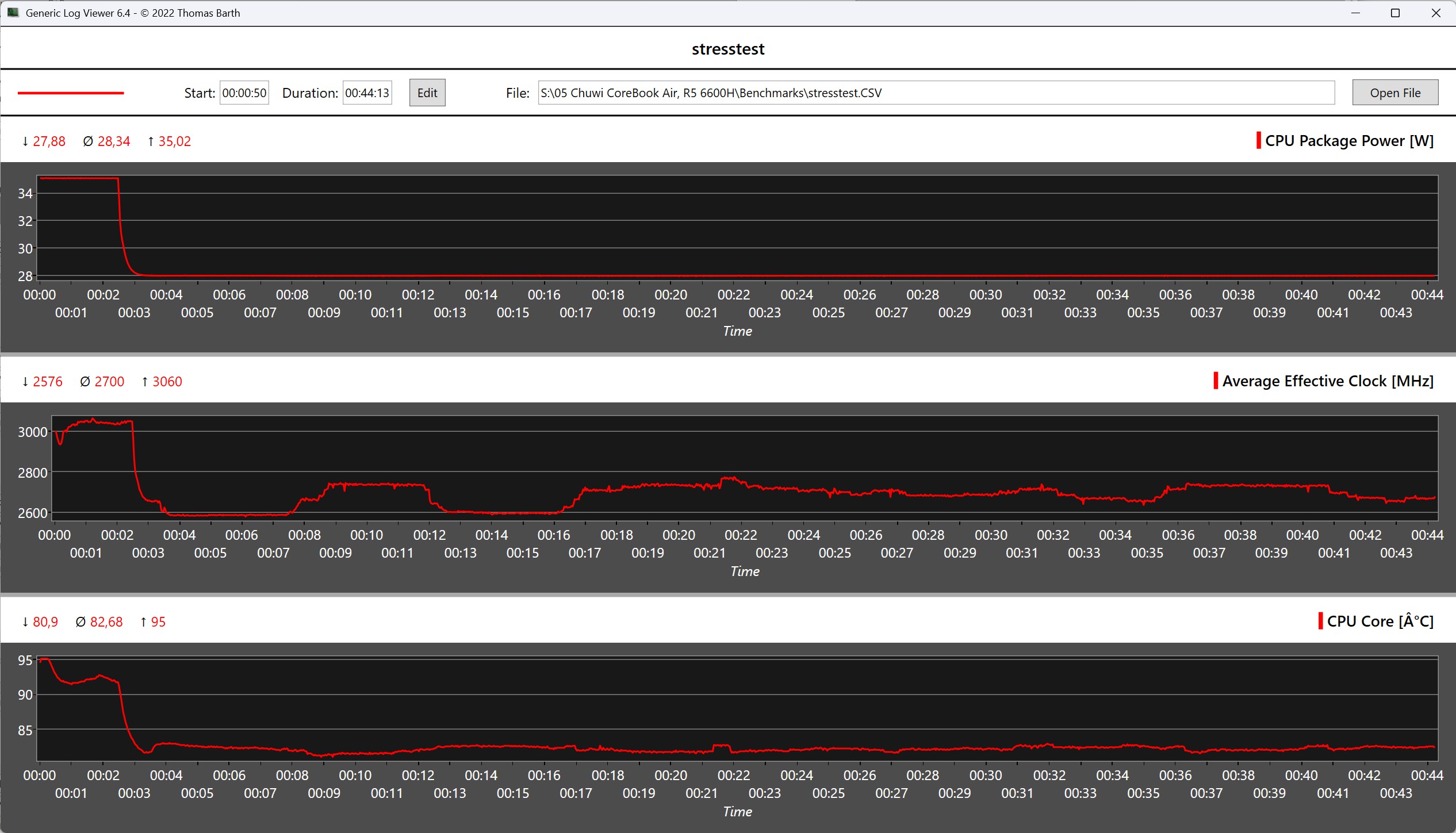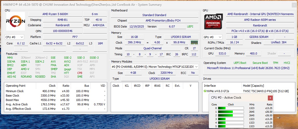 Chuwi CoreBook Air 配备了 AMD Ryzen 5 6600H、6 核处理器,拥有 12 个线程,其设计兼顾了效率和性能。这为传统的办公任务、网络应用、媒体消费以及多个程序的并行工作提供了足够的计算能力。相比之下,我们的测试样品与 Ninkear S14 使用的 AMD Ryzen 5 7535HS 不相上下。仔细观察可以发现,CoreBook Air 中的 AMD Ryzen 5 6600H 的功率长期限制在 28 瓦左右。因此,可用性能低于 CPU 的基本性能。与我们使用相同处理器的平均值相比,这款笔记本的性能落后了约 10%。