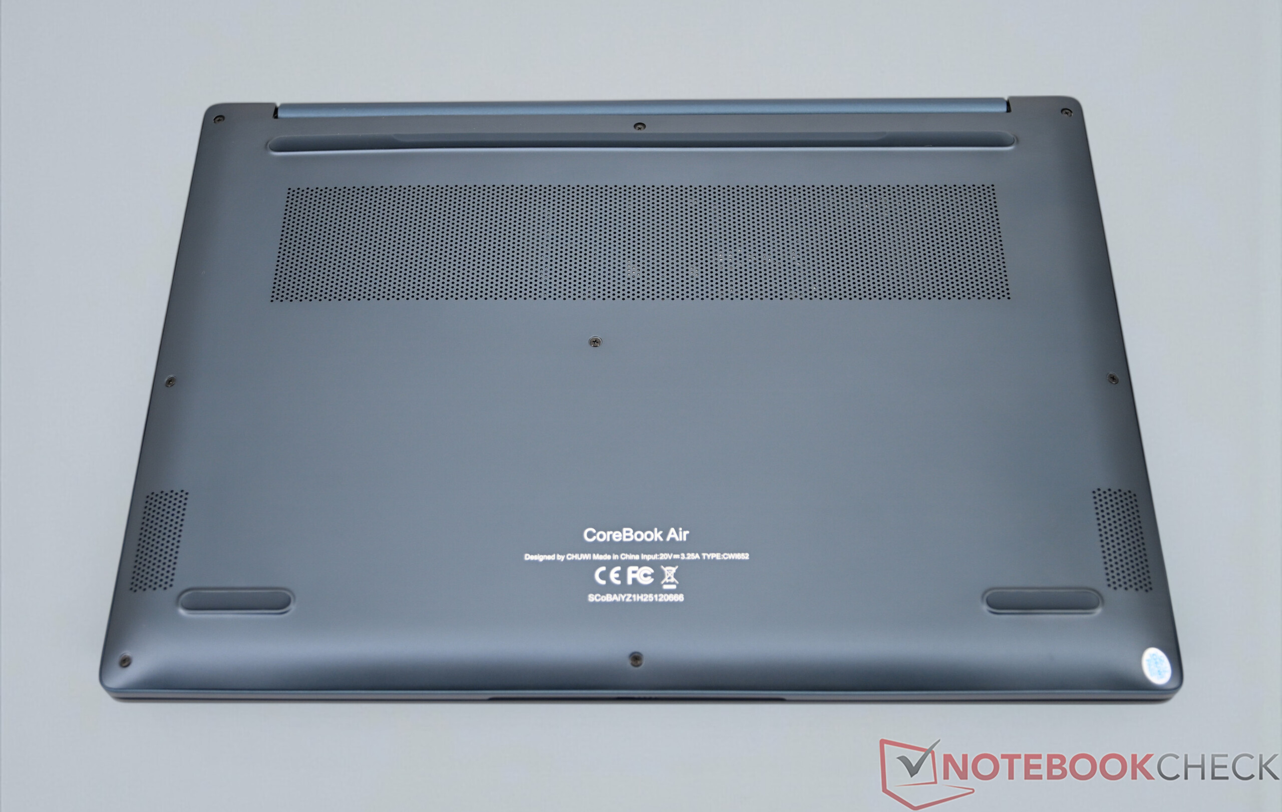 Chuwi 为 CoreBook Air 采用了金属和塑料相结合的材料,从而使这款笔记本轻巧宜人,便于携带。尽管重量很轻,但在日常使用中外壳却非常坚固稳定,即使在较强的压力下也能感觉到表面有轻微的变形。总的来说,该机的做工给人留下了不错的印象,与该机的价格也相符。现有的连接装置功能性较强,但能可靠地满足日常使用中最重要的要求。
