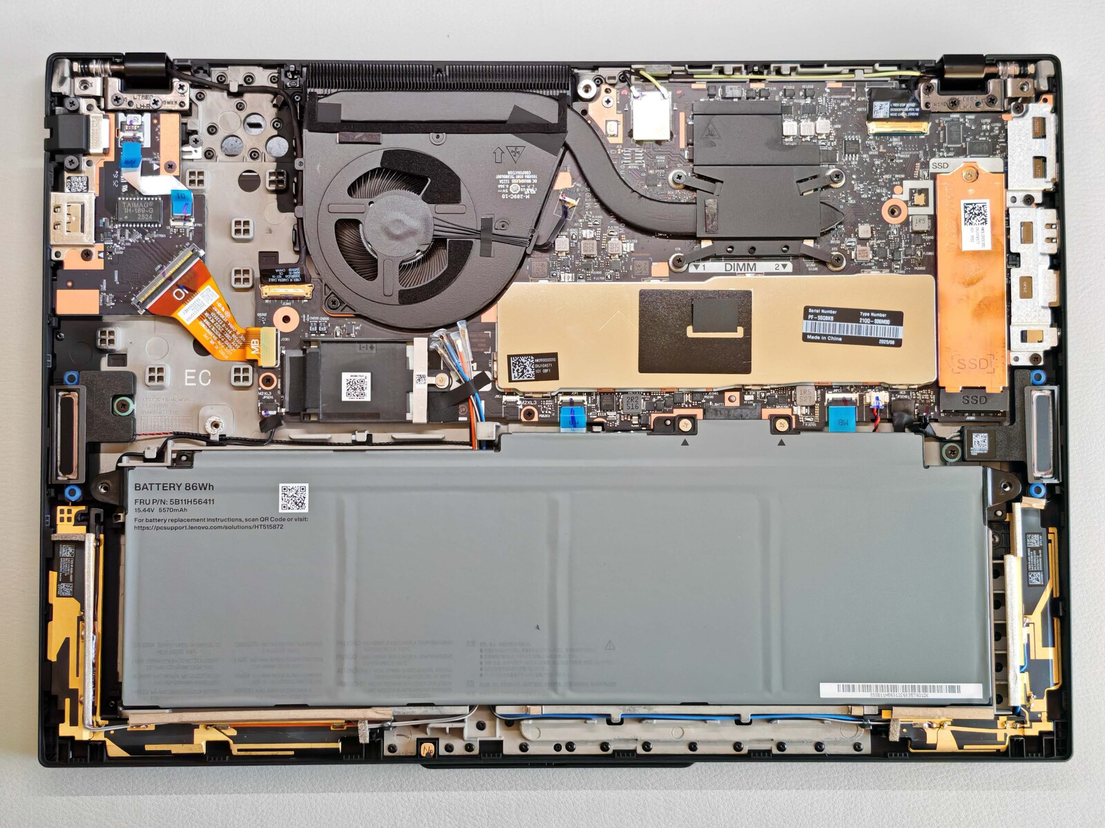 不过,不得不说,联想在这里浪费了潜力,因为联想使用了较小的 ThinkPad T14 的主板,包括带风扇的冷却装置。对于一款 16 英寸的大型电脑来说,28 瓦 TDP 的处理器性能低于人们的预期。如果采用不同的主板和更大的散热装置(2 个风扇),AMD 处理器的性能就会提高一些,而噪音水平也不会受到影响。此外,还可以增加一个 M.2 插槽。