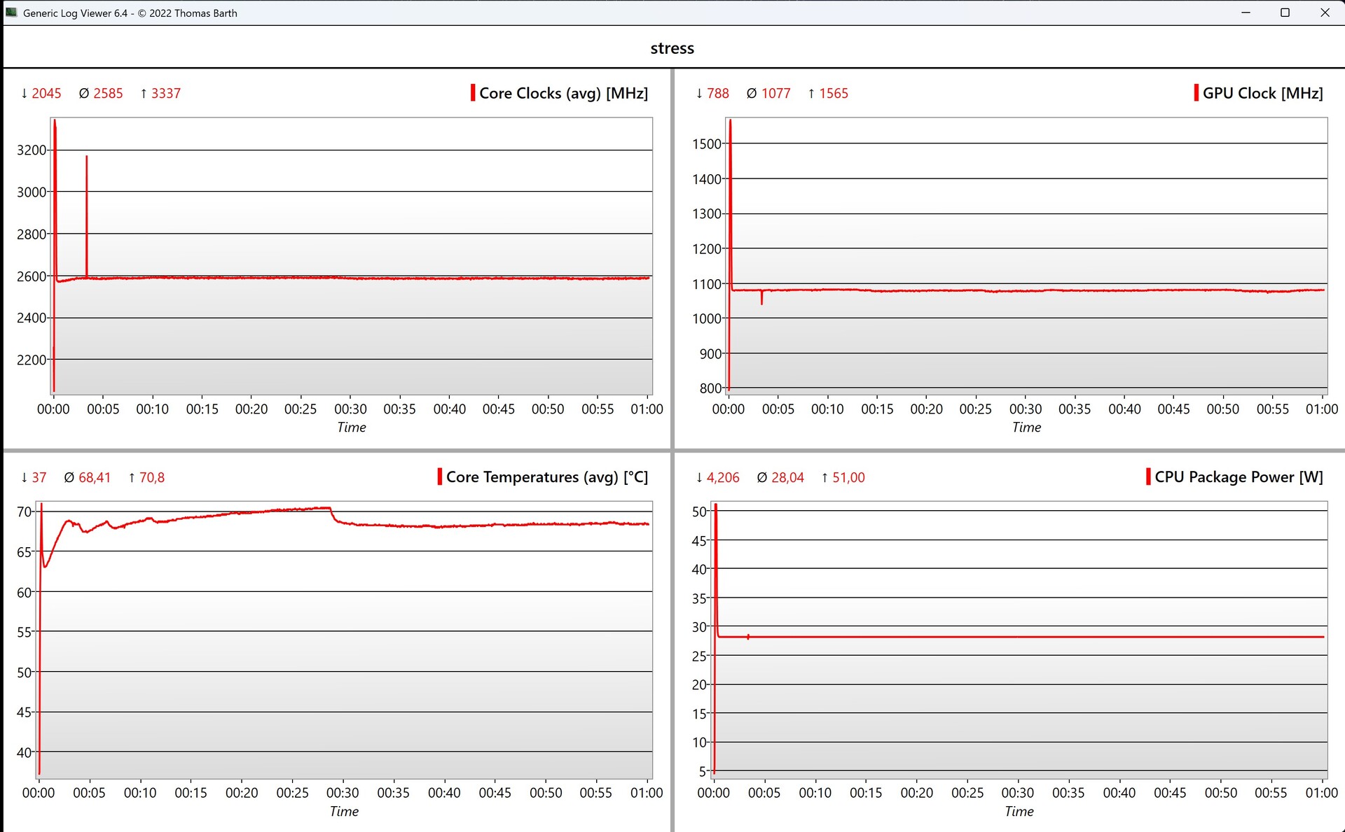 作为一款 16 英寸笔记本电脑,T16 的功耗相当低,即使在最大亮度下,我们在空闲模式下测得的功耗也只有 9.1 瓦。在压力测试中,它的功率曾短暂达到约 84 瓦,但很快又降至约 47 瓦。因此,100 瓦的电源功率已经足够。