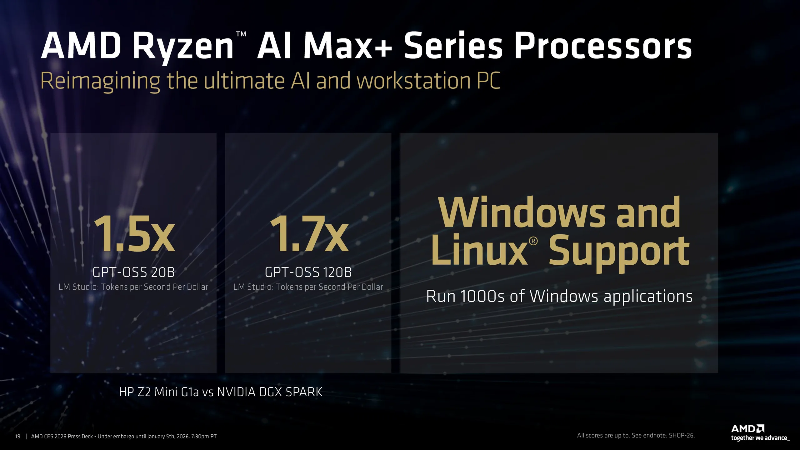在性能方面,AMD 声称 Ryzen AI Max+ 在 LM Studio 中使用 GPT-OSS 20B 模型和 GPT-OSS 120B 模型,每秒每美元的令牌数分别提高了 1.5 倍和 1.7 倍,使用 Ryzen AI Max+ 395 的 2500 美元 HP Z2 Mini G1a 与使用 128 GB 统一内存的 4000 美元 Nvidia DGX Spark 相比。
