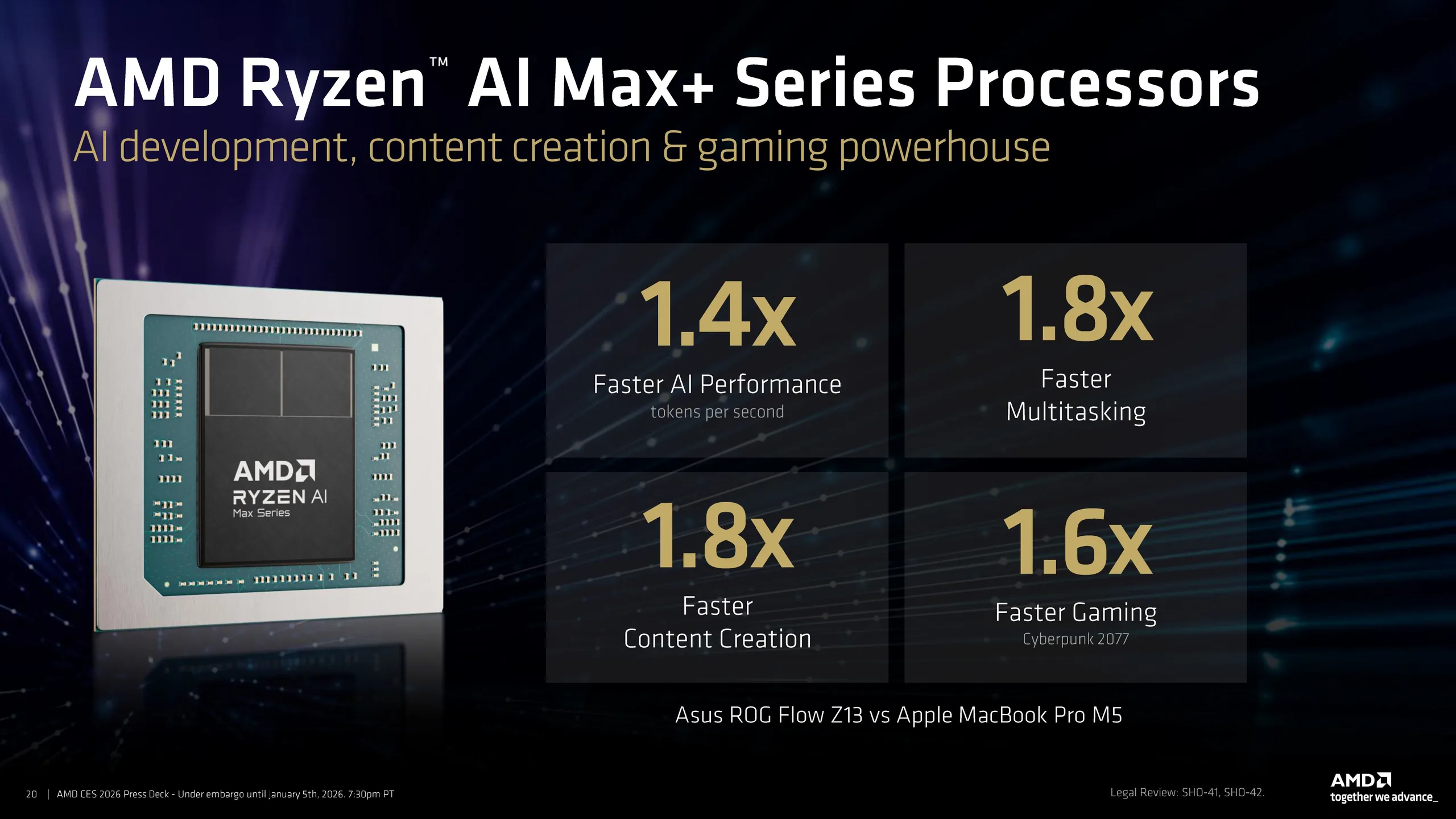 AMD 还宣称,在运行 Ryzen AI Max+ 395 的华硕 ROG Flow Z13 上,AI 性能提高了 1.4 倍,多任务处理和内容创建速度提高了 1.8 倍,游戏速度提高了 1.6 倍。 Apple MacBook Pro 14的 10 核 M5 芯片(平衡配置文件)和 24GB 内存的 MacBook Pro 14 相比,游戏速度提高了 6 倍。