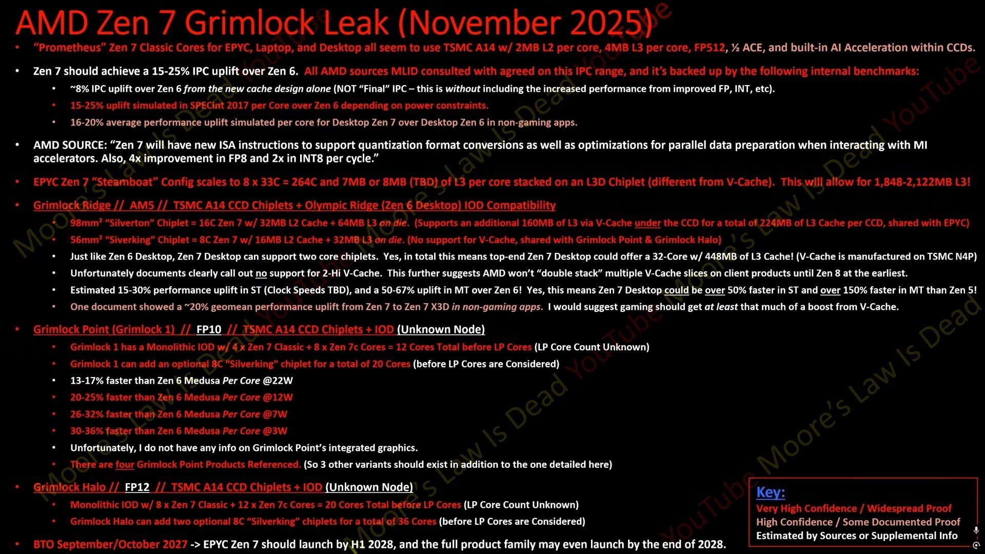 摩尔定律已死"(Moore's Law is Dead)泄露了大量有关 AMD Zen 7 架构的信息。它详细阐述了他之前 Zen 7 泄露信息的一些规格、性能改进和暂定发布日期。它涵盖了广泛的产品,包括消费台式机、笔记本电脑和服务器。