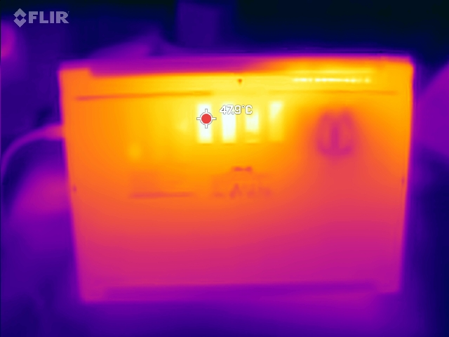 在重负载情况下,铰链区域的底部温度高于顶部,但 47 °C左右的峰值读数并不令人担忧。由于采用了单风扇设计,在极端、不切实际的负载情况下,右侧发热更多,而键盘和掌托则保持适中甚至凉爽。
