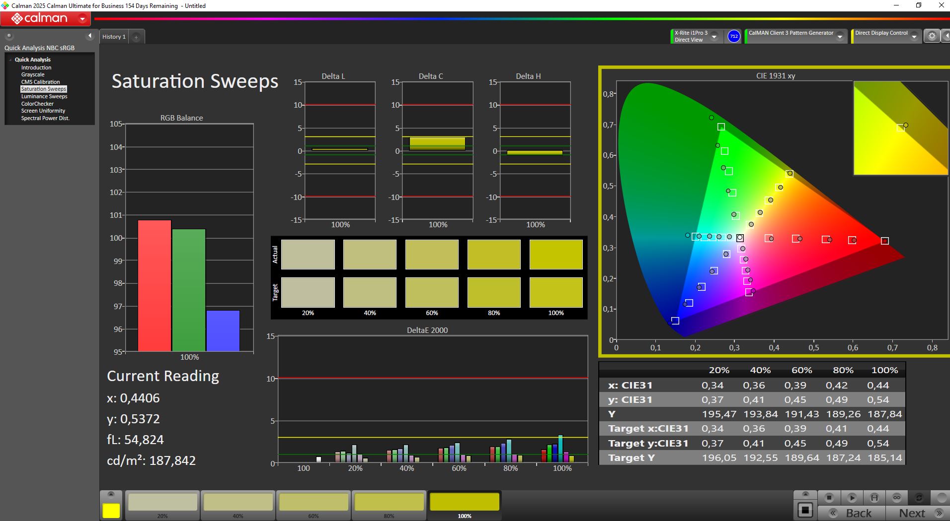 Colorchecker dE 2000 calibrated * | 1.55 | 1.96 -26% | 1.2 23% | 0.6 61% | 3.3 -113% | |