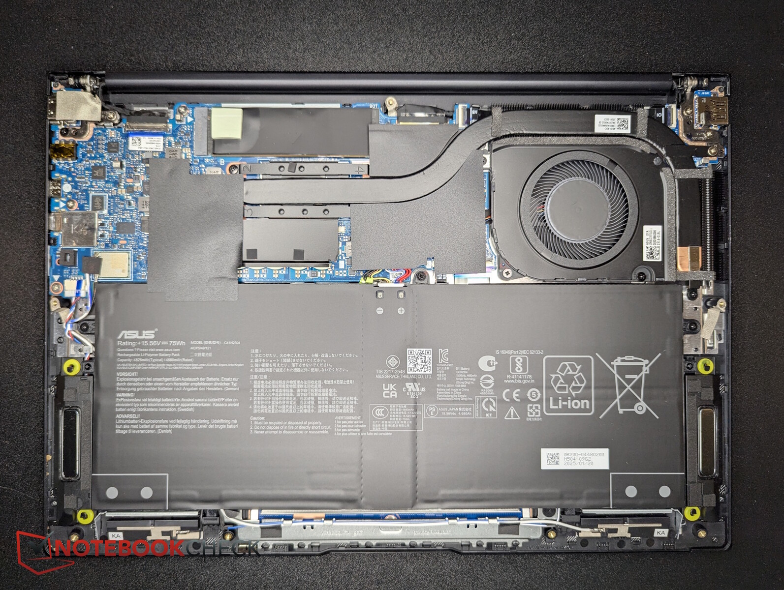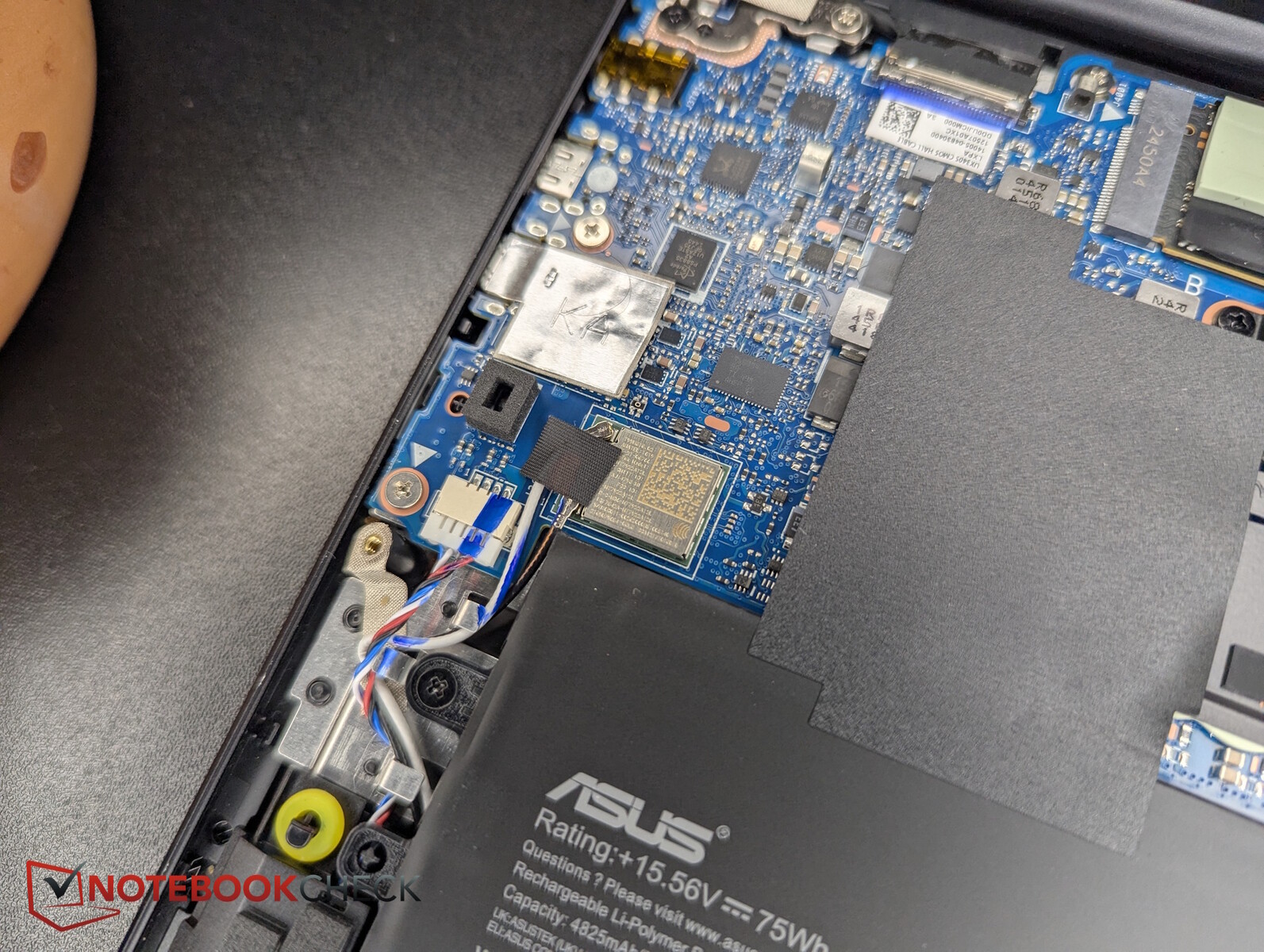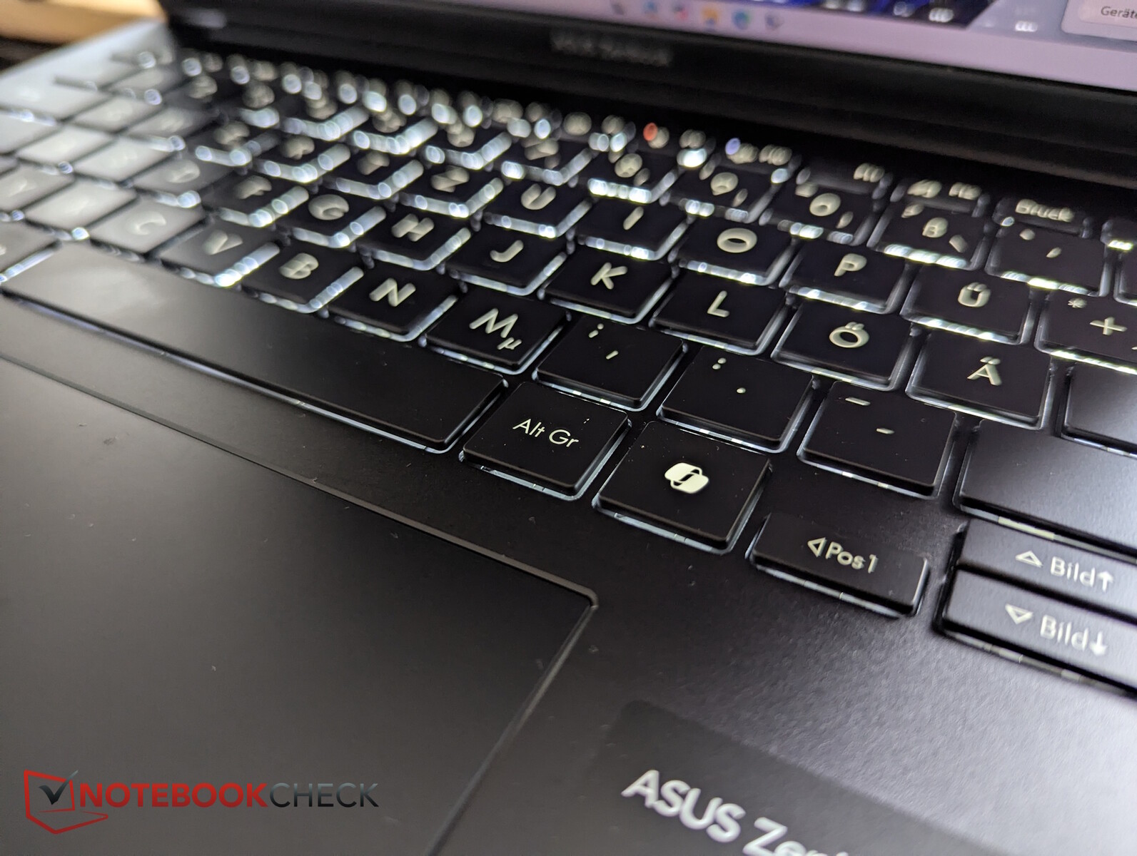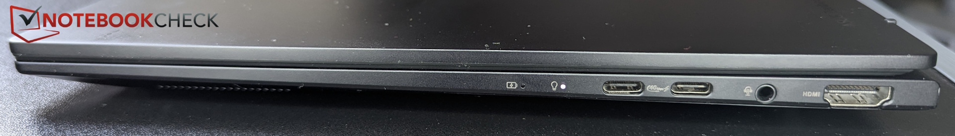 在连接性方面,没有什么显著的变化:USB-A 端口的最高速度仍然是 5 Gbit/s,而且没有读卡器。虽然 英特尔型号提供两个 Thunderbolt 端口,而 AMD 版本则有一个 USB4 和一个 USB-3.2 Gen 2 Type-C 端口。我们还是希望华硕能将两个 USB-C 端口分开,这样你就可以从两侧为笔记本充电,而不用拉长相对较短的电源线。