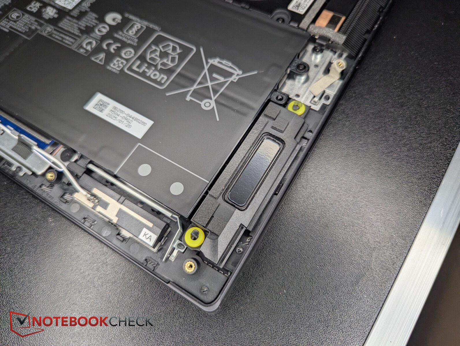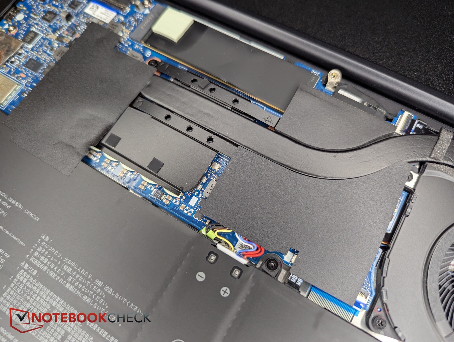 打开底部非常简单:卸下七颗 T5 螺钉,然后撬开底座。在内部,内存是焊接的,许多元件都位于黑色盖子下面。固态硬盘的位置与 英特尔型号从上方看笔记本电脑,单风扇位于左侧。