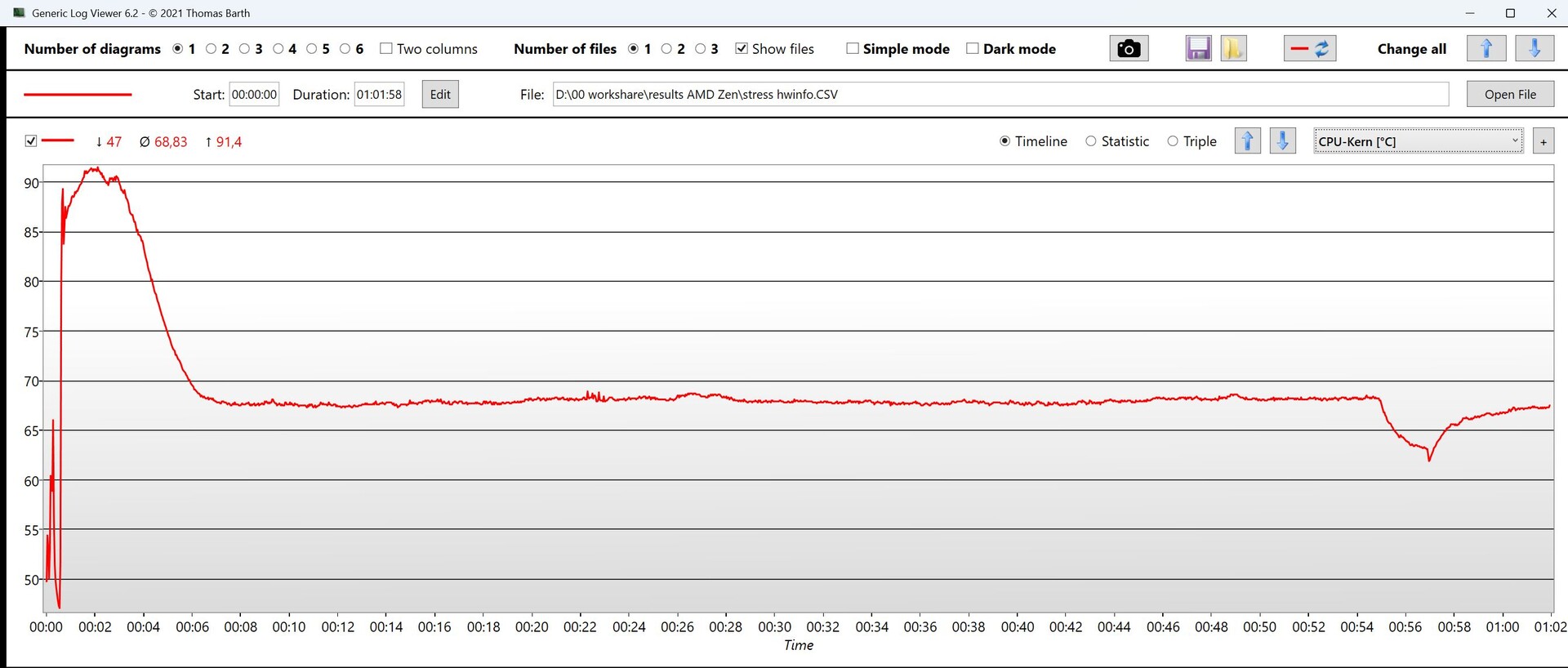 我们观察到的短时功率峰值最高约为 66 W,附带的 65 W USB-C 充电器应该可以轻松应对。