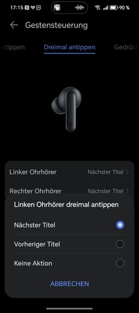 华为的入耳式耳机通过触摸感应表面进行控制。它可以区分双击、三击、长按和轻扫。这在日常使用中效果非常好,而且可以在选项中根据自己的需要进行定制。此外,还提供简化的头部控制功能。