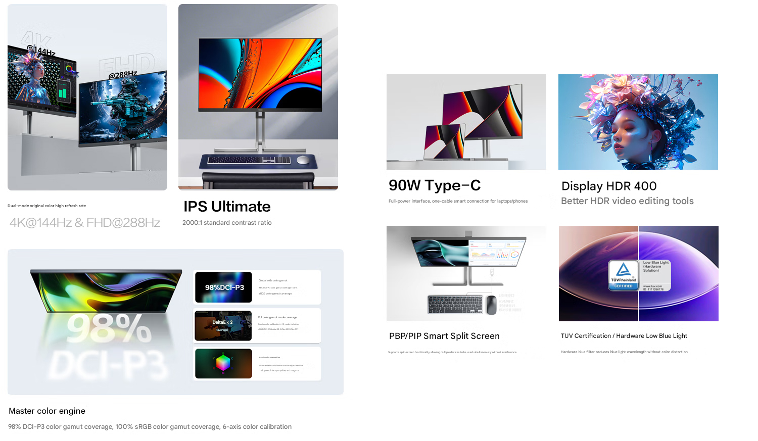 在 4K 分辨率下,显示器的刷新率降至 144 Hz,但清晰度更高,这种模式更适合专业工作负载。说到这一点,AOC U27U3XD 采用 27 英寸 IPS 面板,100% sRGB 和 98% DCI-P3覆盖率。