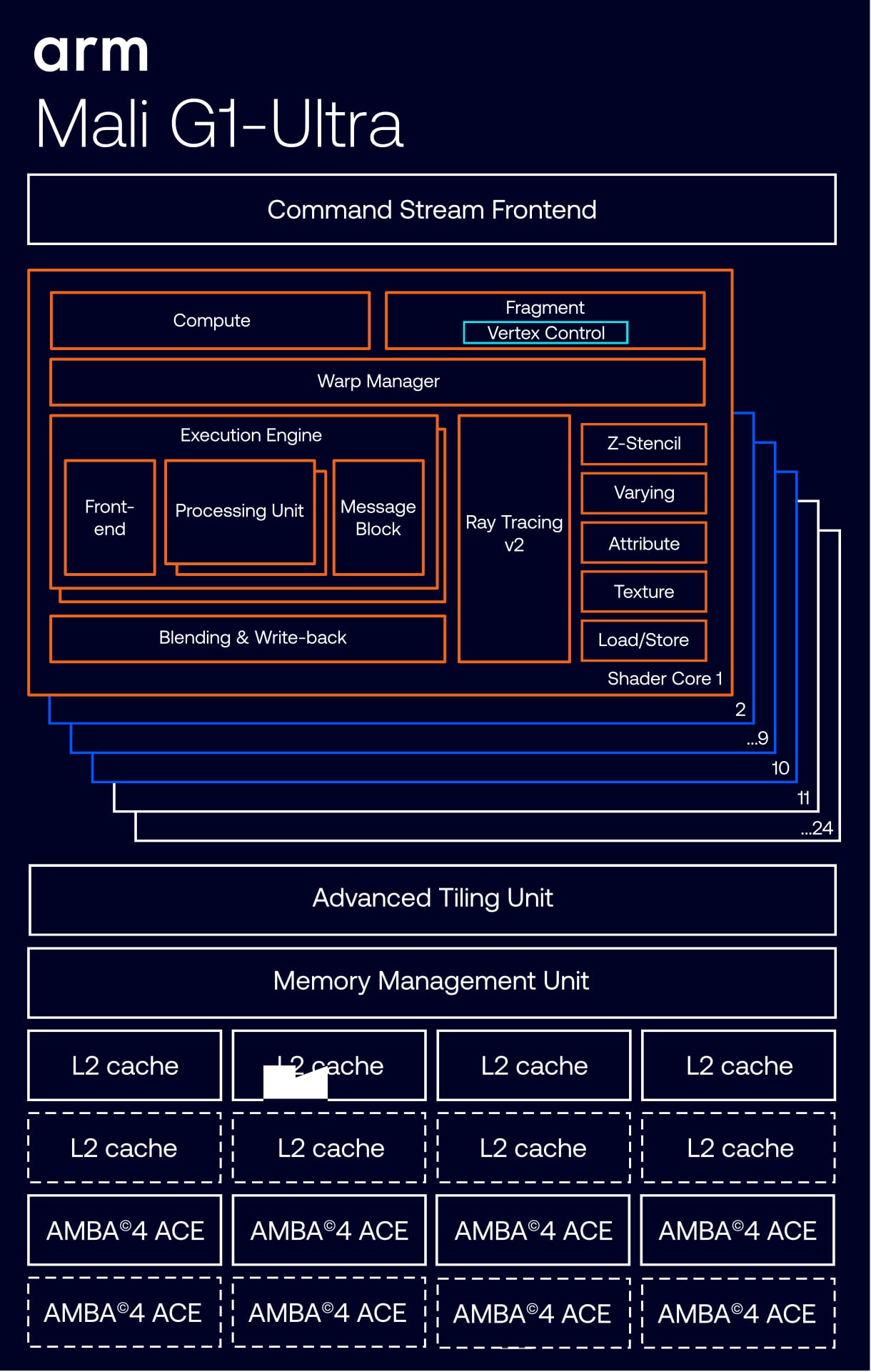 ARM Mali G1-Ultra MC12(MP12)是用于智能手机和平板电脑的高端 GPU,首次以这种形式出现在联发科 Dimensity 9500 中。 它使用 12 个内核,基于第五代 GPU 架构。Ultra 型号始终支持光线追踪(第二代),根据 ARM 公司的说法,光线追踪性能应该是其前代产品(Immortalis-G925)的两倍。