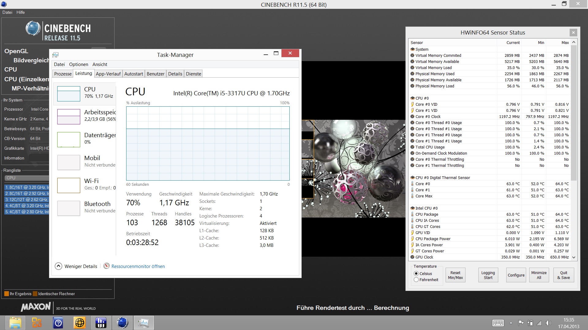 To keep the temperatures from creeping up even higher, both the processor and the graphics card are subjected to throttling: initially, the CPU starts out at 1.7 GHz, but then drops to 1.5 GHz and even 1.2 GHz with only occasional spikes back to 1.7 GHz. Turbo Boost is not used any longer. The GPU starts out at 1050 MHz but drops to 900 to 950 MHz.