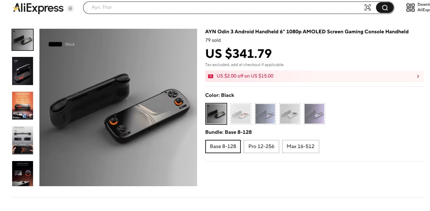 - AYN 雷神 Pro(骁龙 8 代 2,12GB 内存 + 256GB 存储)- $375.44
