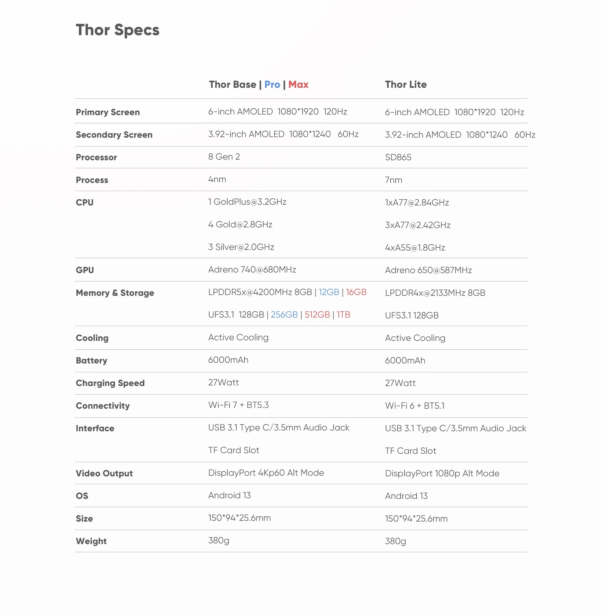 存储类型的变化会影响 骁龙 8 第二代-版本的雷神手机。其中包括配备 8GB 内存和 128GB 存储空间的 Thor Base、配备 12GB 内存和 256GB 存储空间的 Thor Pro 以及配备 16GB 内存和 512GB 存储空间的 Thor Max。Thor Lite 配备了 骁龙 865 处理器已使用 UFS 3.1 存储,并将继续使用。