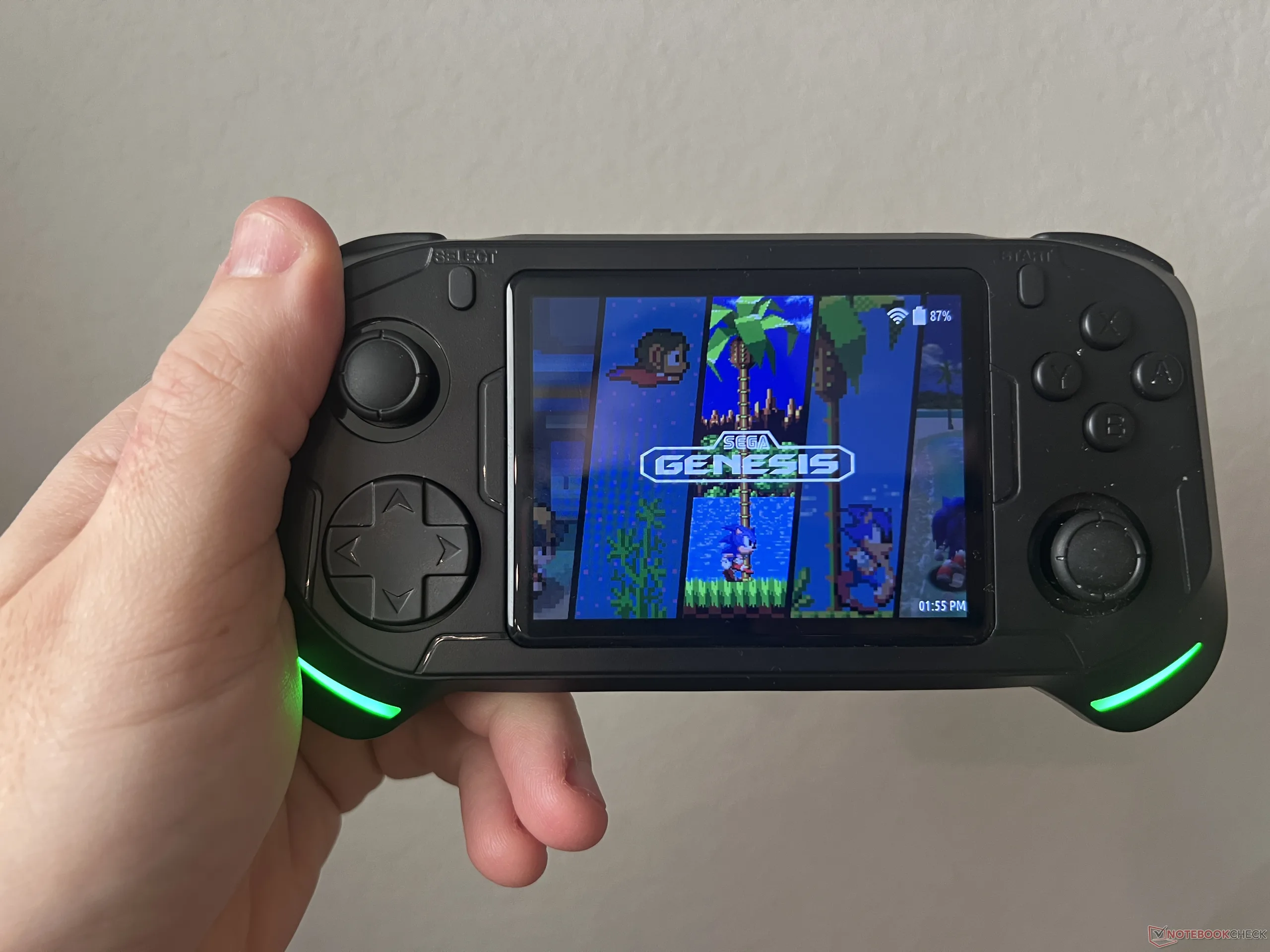 每个手柄底部都有两个绿色 LED 灯带,为手柄增添了几分亮点。颜色无法更改,但可以设置为暗、亮或呼吸。背面有两个内置扬声器,底部有两个 USB-C 端口(一个用于充电,一个用于连接控制器)和一个 3.5 毫米音频插孔。顶部有一个迷你 HDMI 端口,用于连接电视。