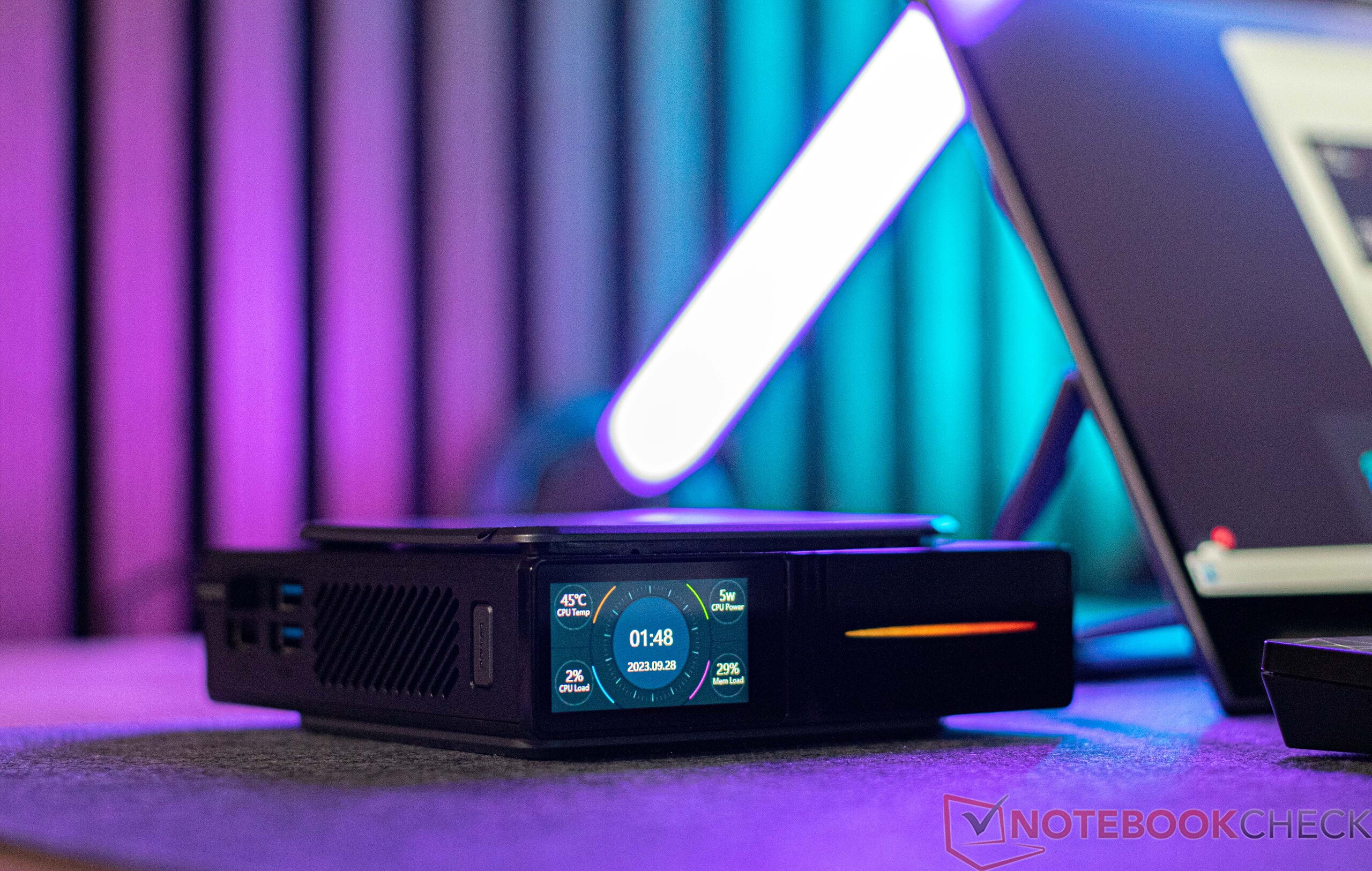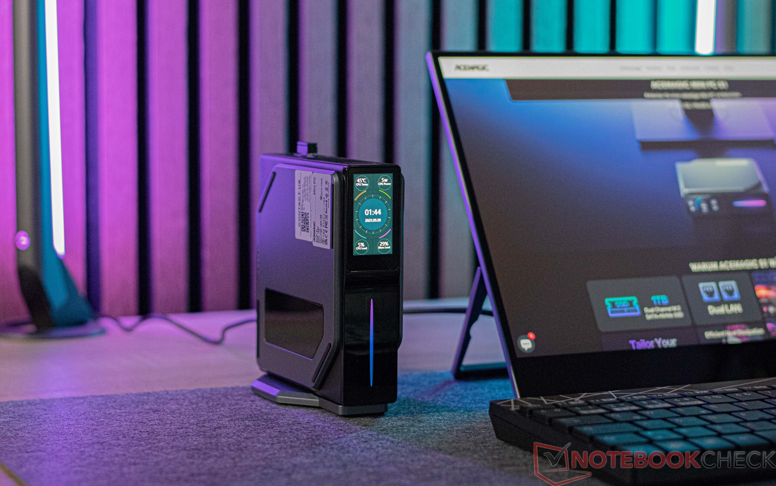 Acemagic S1 主要由塑料制成,总的来说,我们的评测设备制作精良。正面内置了一个小型显示屏,可显示迷你电脑的部分数据。Acemagic S1 可以垂直和水平操作。底座附在包装盒中,通过磁性连接器固定在主设备上。这意味着该设备所需的桌面空间大大减少。在水平使用时,Acemagic S1 的占地面积约为 12.4 x 12.8 厘米,与其他一些迷你电脑相比略大。不过,我们的评测设备(包括支架)仅重 440 克,并不算太重。相比之下,如果不带支架,它的重量仅为 380 克。对于机箱本身,我们没有任何抱怨。从正面看,左侧很容易拆卸,以便存取内存和固态硬盘。与此同时,还有一个小视窗,由于设备内部没有任何照明,所以这个视窗并不合理。